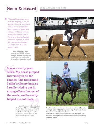 Top: Rebecca Hart won her seventh consecutive National Title after winning the 2015 CPEDI3* Championship High Performance Division Championship with Schroeter’s Romani. Bottom: Mary Kathryn Clark and Questafir were the top U.S. combination at the 2015 FEI World Endurance Championship for Young Riders and Juniors.