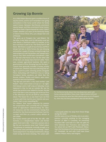 Growing Up Bonnie As a child, Robert Bonnie spent countless hours at equine events, and he can’t remember ever going somewhere in the horse world where his family wasn’t known. Between Ned Bonnie, prominent equine lawyer, and Nina, prominent horse trainer, plus Nina’s deep Virginia equestrian roots, it didn’t matter whether you were at the Kentucky Derby or Devon Horse Show (Pa.), you always had a lot of friends. “We grew up in Prospect, Ky.,” said Robert. “At the time, it was fairly rural. It’s still pretty rural, but now there’s a Starbucks within 15 minutes, so it’s less rural than it used to be. The family farm is still there. We’d have a couple of race horses, and Mom always had two or three horses she was showing and another couple of horses coming through that were projects to sell. My brother and I always had a pony or two. Mom would have a broodmare. Later on, she had a flat horse or two. On the other side of the farm, we always had a herd of cattle. There was a proper agricultural business. We spent a good amount of time throwing hay into the barn.” Leisure time generally included a horsey activity of some sort, whether that was watching Dad riding in a point-to-point, showing ponies alongside Mom, foxhunting with Piedmont (Va.) or taking horseback family vacations out West. But the Bonnie children, Shelby and Robert, were never pushed to become horsemen. “My dad was and still is a very hard worker,” said Robert. “He’d come home at 6:30 or 7 at night. He’d always work a half a day on Saturday. It was balanced in that he had an outside life, but his whole law practice was related to horses. My dad was in the barn in the morning and at the law firm in the afternoon, but it’s all stuff he cared deeply about. The lesson for us was that if you can find a career path that marries your interest and your career, that’s a very rewarding life.” For Robert, that meant exploring his passion for conservation. He’s currently the U.S. Department of Agriculture undersecretary for natural resources and the environment, having first worked for the Environmental Defense Fund for 14 years and then as a senior policy advisor at the USDA. But horses remain part of his life. His wife, Julie Gomena, is a steeplechase trainer and former upper-level event rider. “I married a woman who is like the son my parents never had,” Robert joked. “My getaway on weekends, ironically enough, is to go to horse races and those sort of things. I didn’t move away from it. I’ve always loved horses, always loved racing and horse showing. The career path
