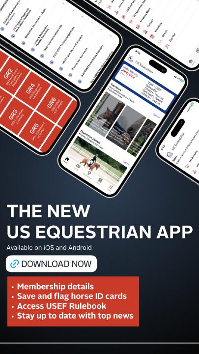Equestrian Magazine (ISSN 1548-873X) is published five times a year: Horse of the Year Special Edition, Spring, Summer, Fall, and Winter, by the United States Equestrian Federation®, 4001 Wing Commander Way, Lexington, KY 40511; Phone: (859) 258-2472; Fax: (859) 231-6662. (ISSN:1548-873X). NOTE: Effective Spring issue of 2018, Equestrian magazine will be published and provided electronically and only four editions will have printed copies and be provided by U.S. Mail. The Winter issue will only be provided electronically. The Horse of the Year issue will be mailed only to competing members as of the date of publication and the year immediately prior to the date of publication. USEF is not responsible for the opinions and statements expressed in signed articles and paid advertisements. These opinions are not necessarily the opinions of USEF and its staff. While the Federation makes every effort to avoid errors, we assume no liability to anyone for mistakes or omissions. It is the policy of the Federation to report factually and accurately in Equestrian and to encourage and to publish corrections whenever warranted. Kindly direct any comments or inquiries regarding corrections to Debbie Elliot delliot@usef.org or by direct dial 859-225-6941. POSTMASTER: Send address changes to US Equestrian, 4001 Wing Commander Way, Lexington, KY 40511. Canadian Publications Agreement No. 40845627. For Canadian returns, mail to Canada Express, 7686 #21 Kimble Street Mississauga, Ontario, Canada, L5S1E9. (905) 672-8100. Reproduction of any article, in whole or part, by written permission only of the Editor. Equestrian: Publisher, United States Equestrian Federation®, Chief Executive Officer, William J. Moroney (859) 225-6912. Director of Advertising, Kim Russell (859) 225-6938. Copyright © 2025 Equestrian is the official publication of the United States Equestrian Federation, the National Governing Body for Equestrian Sport in the USA, and is an official publication of USEF.
