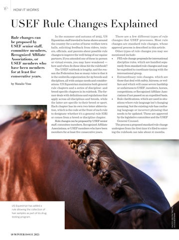 Additional virtual and in-person events are planned in the coming months. Please visit usef.org/forms-pubs/pqhOtcLkQSU for the most up-to-date schedule as event details are confirmed. A new round of proposed rule changes — some of which relate to horse welfare — is available for members to comment on as the rules work their way through the consideration process. To view the list and to leave your comments, please visit usef.org/rulechange