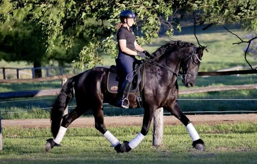 A sweet, affectionate boy, completely unflappable, willing with an excellent temperament. Modern, extravagant Friesian movement, established laterals, starting walk and canter transitions and collected work.