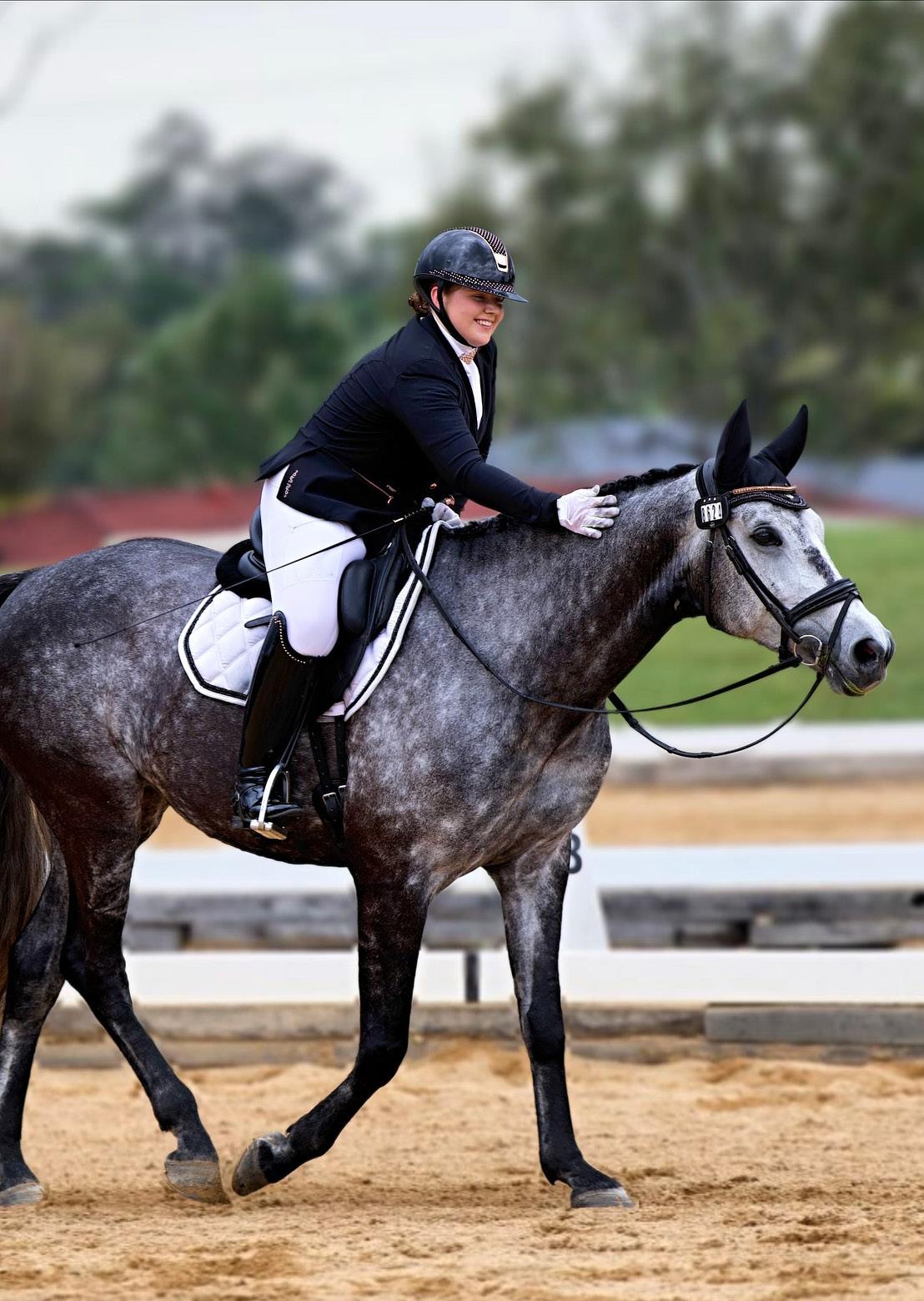 FAR LEFT: Saf and Stella the day she arrived. LEFT: Senior Preliminary Dressage Champions ISHE 2025.