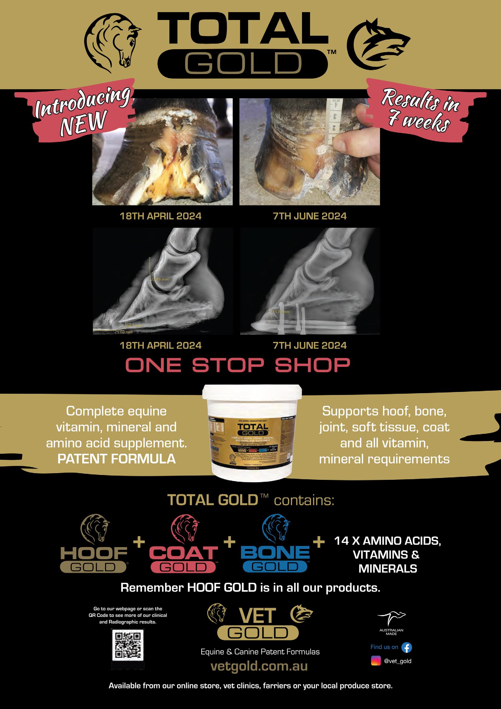 Thanks to our amazing friends at Kennallywood Stud, Peak Vets and Advance Vets for their support and care, we were able to keep her at home and manage the rehab ourselves. We kept it clean and dry for two months until it healed. We also added TOTAL GOLD