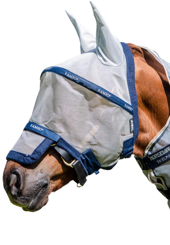 With an extremely durable textilene body, the Rambo fly mask with detachable nose protection features large fitting, soft polyester ear mesh, comfortable fleece edging for ultimate protection against flies and the damaging effects of sunlight, and an improved design for optimum eye protection. Adjustable closures with elastic allow your horse to graze comfortably. Rambo Plus Fly Masks run slightly large, so sizing down is sometimes advisable.