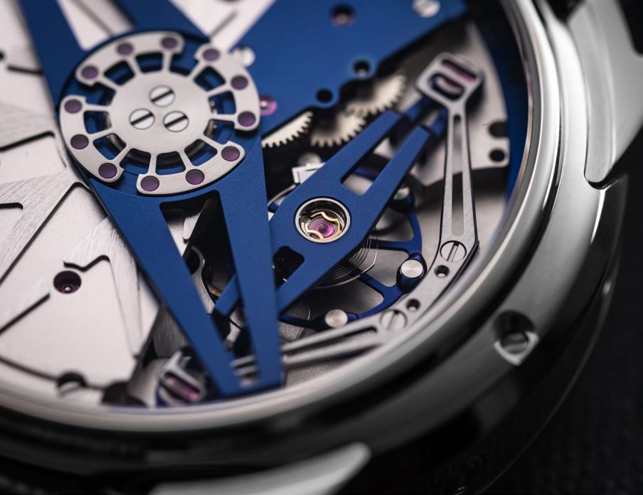 Within the titanium case sits the gray and blue hand-guilloché patterned dial. Approachable in its configuration, yet expertly executed by its many textures and curves the display follows previous DB25 models in its style while demonstrating a De Bethune suave specific to the new colorway.