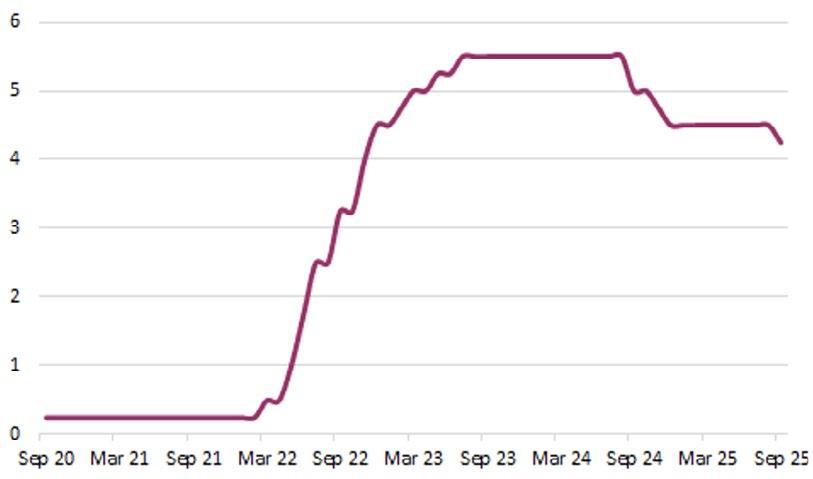 The UK economy continues to grow at a relatively anaemic pace, around 1.3% p.a. In the US, despite a negative quarter around the tariff announcements, growth has generally been stronger and remains above 2% p.a. However, this is down from the 3% p.a. we were seeing this time last year.