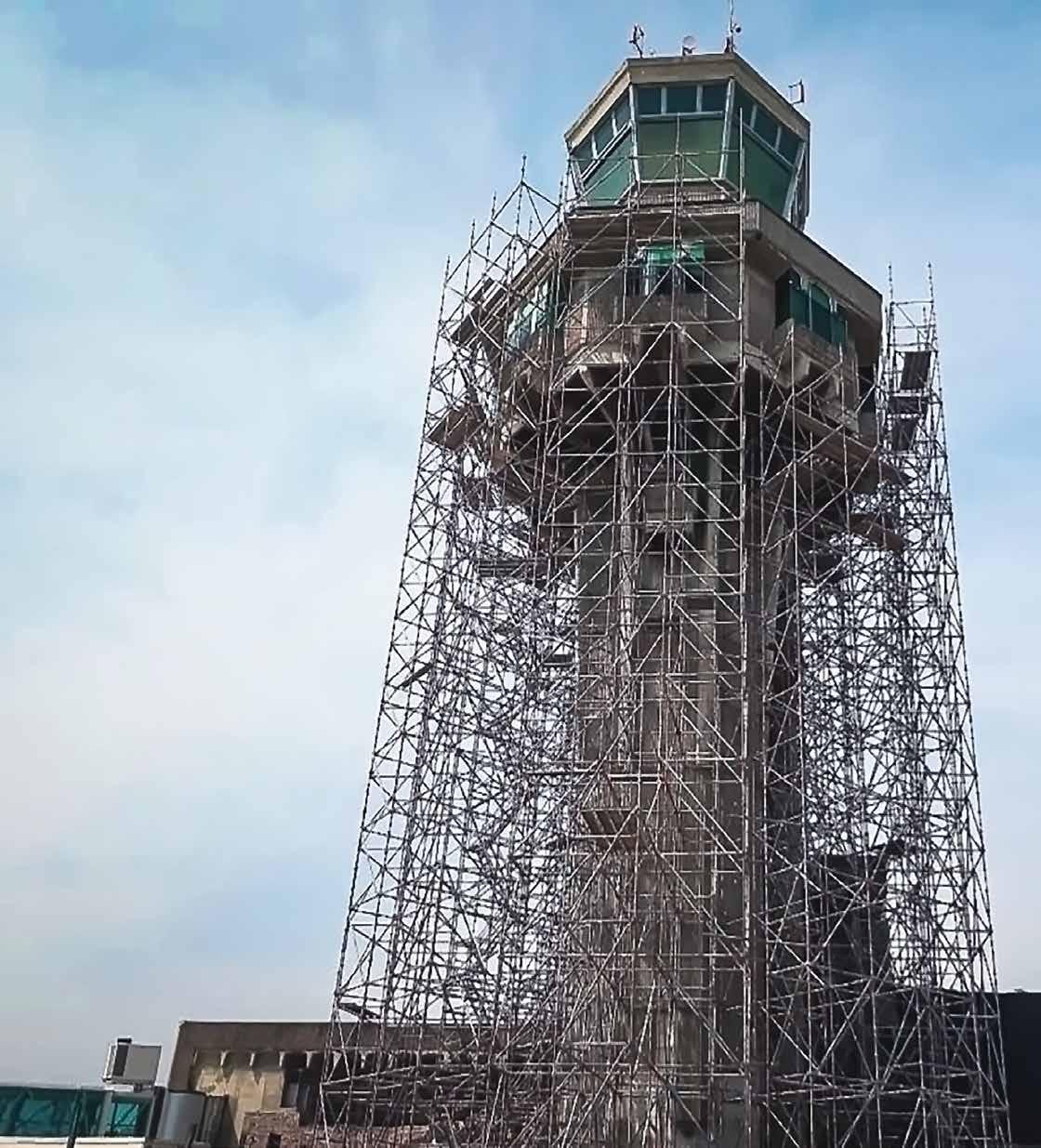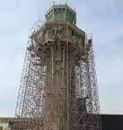 SMART STEEL Torres de andamio multidireccional para alcanzar una altura de 36m con ménsulas en el interior de la estructura metálica del Faro incluyendo tuberías de arriostramiento para garantizar la estabilidad de la torre debido a la poca disponibilidad de espacio.