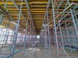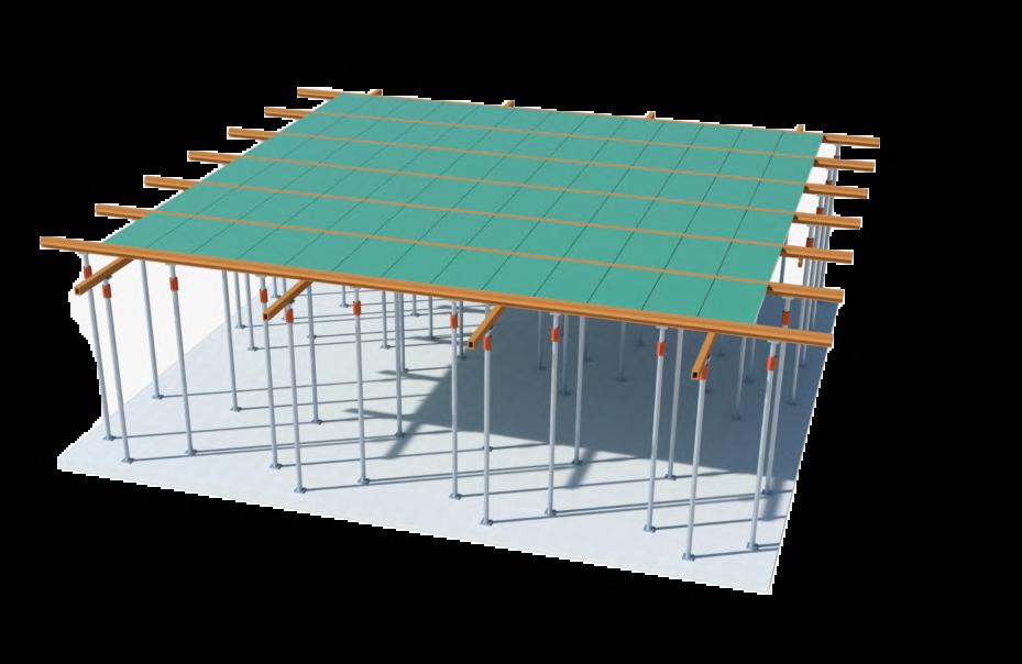 Sistema de encofrado horizontal con soportes en andamio de carga Symons, vigas primarias en aluminio, vigas secundarias en madera “Ref. H20” y cara de contacto en tablero Plywood de 18 mm.