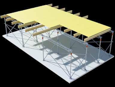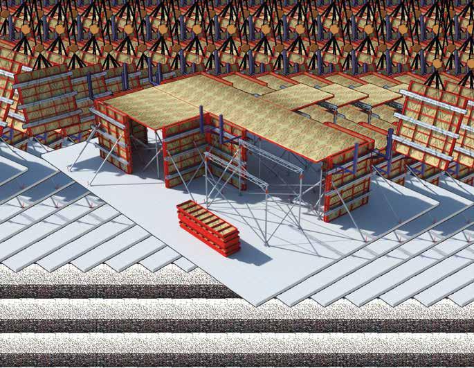 CONSORCIO GRAN BAZAR El tipo de estructura es una losa con una inclinación elevada, que causa que los sistemas convencionales no funcionen de manera adecuada debido al empuje lateral que ellas generan. Se emplean andamios de carga simple con un sistema de arriostramiento para neutralizar las fuerzas laterales, permitiendo que el sistema sea seguro y estable.