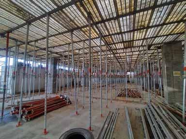 Se le plantea al cliente la solución de usar el sistema de losa tipo ulma, combinado con sistema tradicional para vigas descolgas. Sistemas que se acoplaron y adaptaron adecuadamente, abarcando un total de 960 m2. Y más de 50 toneladas de equipos