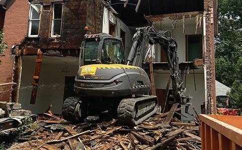 One last point. Demo cleanup excavators tend to idle more often, and that eats into profitability by burning extra fuel and racking up unnecessary machine hours. When you idle, you’re adding hours on the machine, you get to the next service interval faster, your lease runs out faster, your extended warranty ends earlier and so on. Better-built machines include features to prevent excessive idling, like an auto-idle feature that automatically switches the engine to the idle setting after ve seconds of inactivity, lowering the engine’s rpm and saving fuel. Some also come with an engine auto-shutdown feature to shut down the engine when idling for a certain period when the control lockout lever is down. ose savings really add up over time.