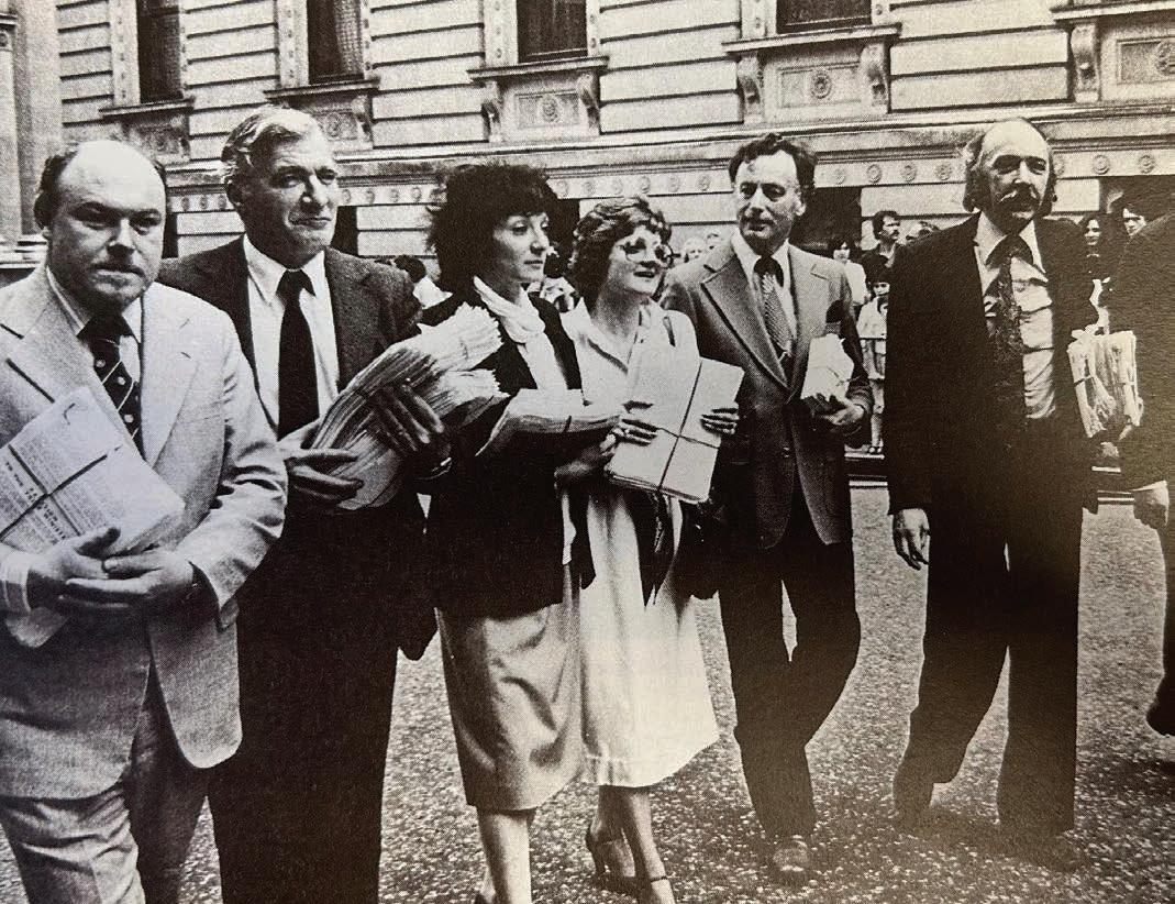 An Equity delegation heads to 10 Downing Street on 15 April 1980 to hand in a petition calling for an end to VAT on theatre tickets. From left to right: Timothy West, Nigel Davenport (Vice-President), Jane Lapotaire, Julia McKenzie, Paul Eddington, Peter Plouviez (General Secretary), and John Barron (President).