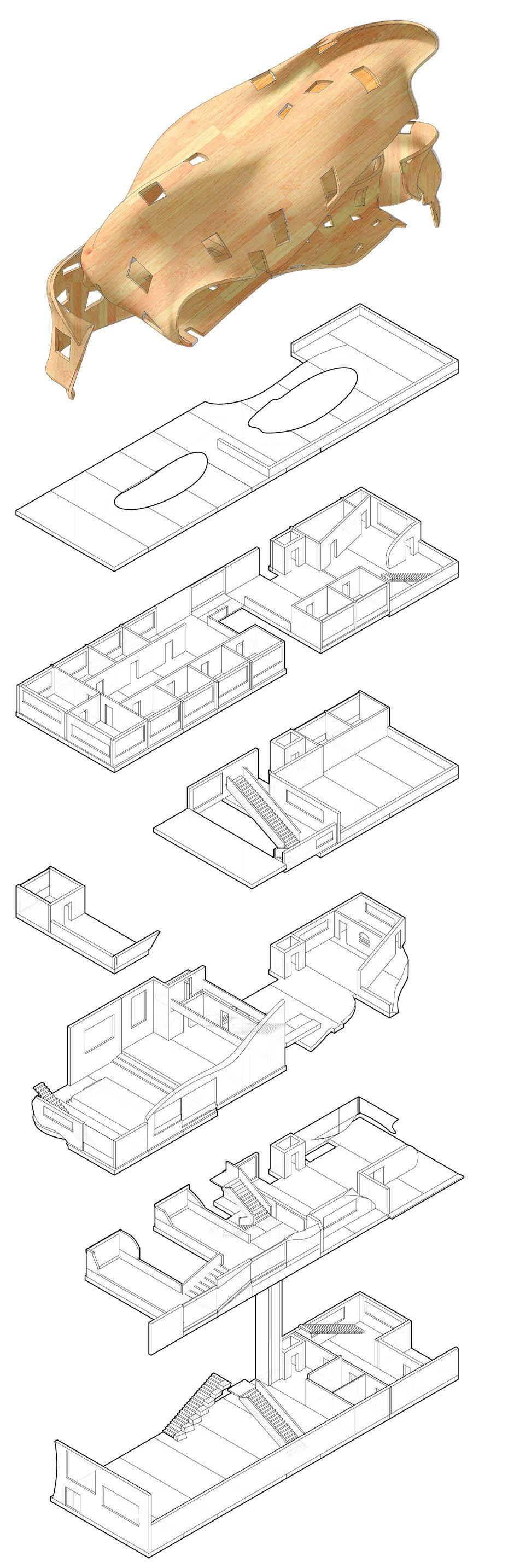 Ribbon Building, Axon and Exploded Axon. Illustrations of Interior and Exterior.
