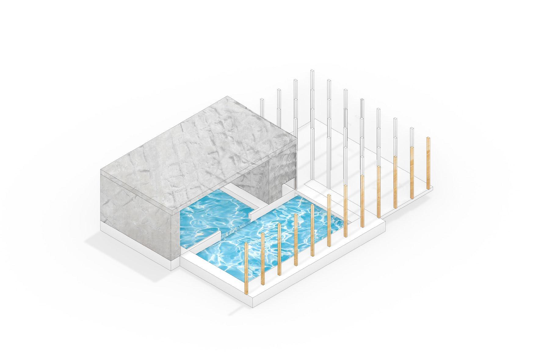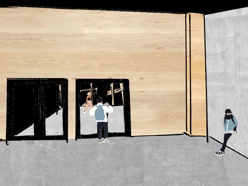 Waffle, was designed with all of these consideratoins in mind. Taking inspiration from the historical aspects of the campus of Umass (both geologic and historical), it introduces two separate languages. The “Rock,” is based on the metamorphic outcrops of the Connecticut Valley, and contains the playful water-based spaces of the natatorium, bringing the outdoors inside. The “Waffle,” is a reimagination of the Brutalist concrete waffle motif seen on multiple campus buildings, such as Breuer’s Lincoln Campus Center and Tobin Hall, designed by Coletti Brothers. The wooden waffle encases the natatorium, allowing for both sunlight and privacy, while also providing a simple structure solution to the long span needed over the olympic pool. The following two pages explore the experiential aspects of this building through collage and collaged sketches, along with the conceptual aspects, depicted through a series of axonometrics drawings.