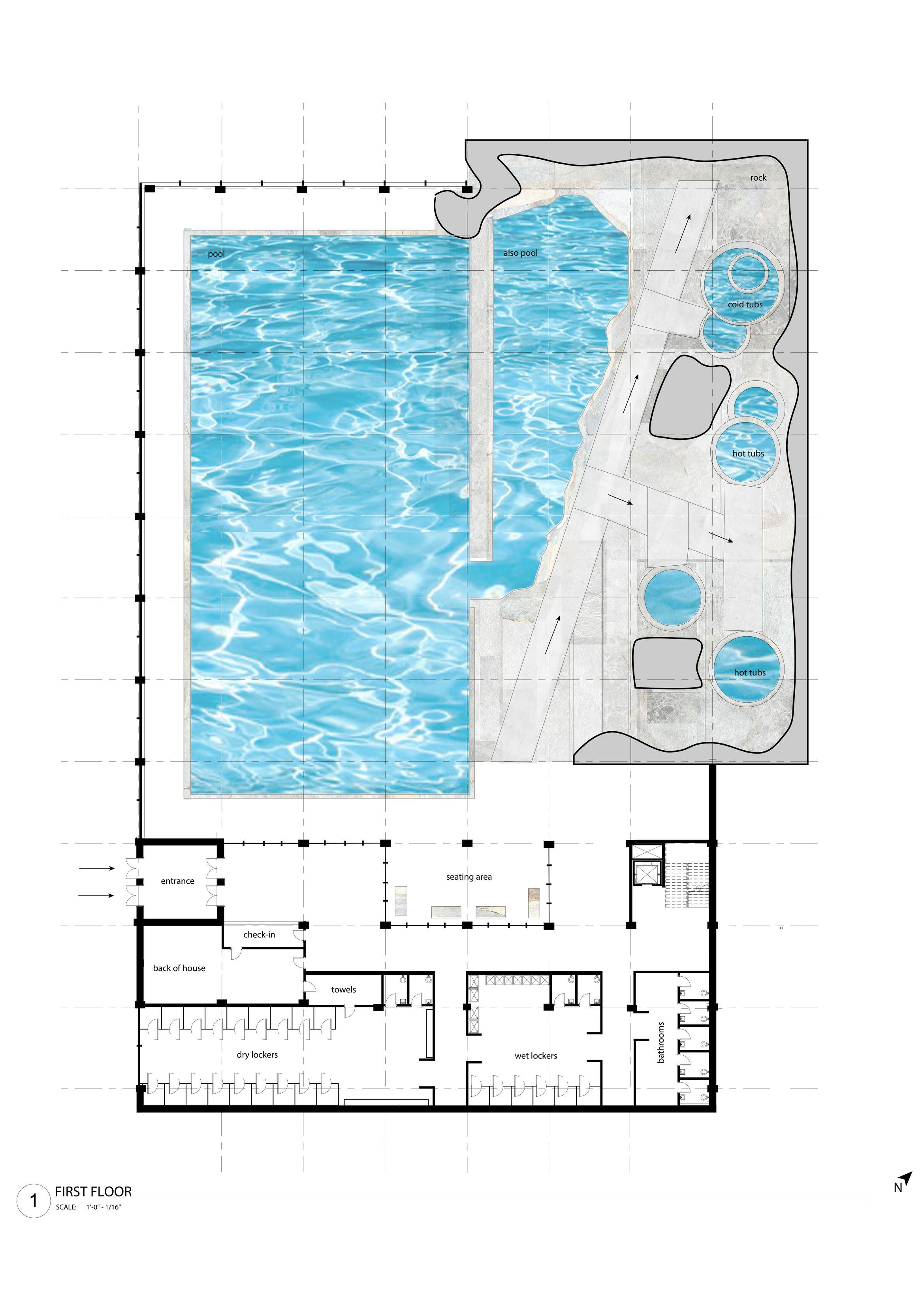 This studio was structured around the exploration of “wellness,” especially with regards to the rejuventaing aspects of water. While the end goal of this class was indeed to design a wellness center containing a natatorium both an olympic pool and recreational swimming areas for our campus (UMass, Amherst), the curriculum challenged us to consider wellness holistically. (1) As college and university campuses evolve to include “wellness” as part of their culture, what does this changing definition of wellness mean? (2) On a broader sense, how can this building be a circulatory center of campus, connecting students, faculty, and staff alike? (3) Holistically, can we design the building itself to be “well,” by using mindful materials (ie. wood, local stone), and what would this look like?