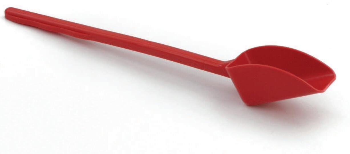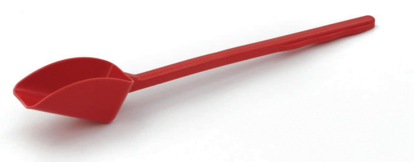 A long handle can improve the ergonomics for the operator and make the scoop a lot more visible if it is left in the product
