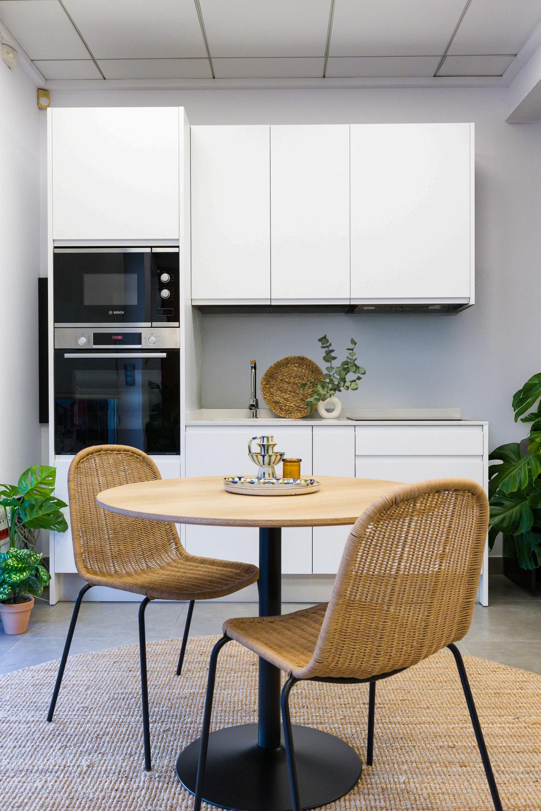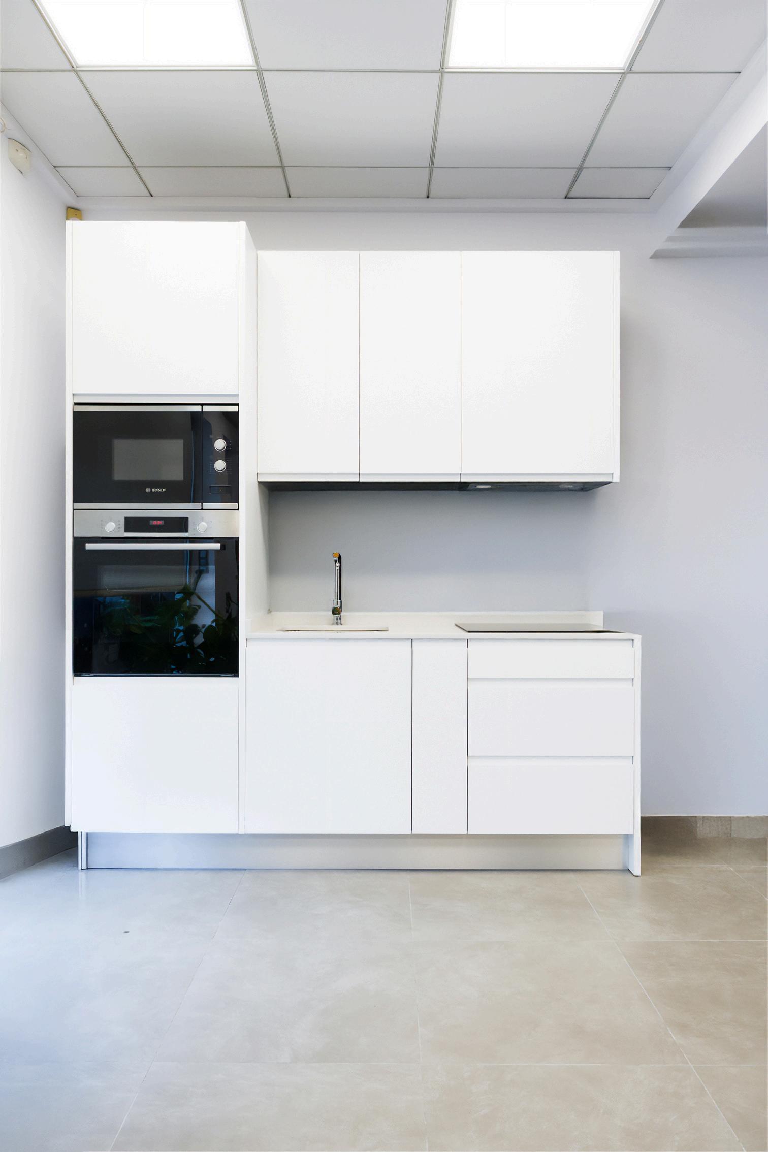 Cocina equipada con muebles altos y bajos. Cajones y puertas con sistema autofreno. Encimera de aglomerado de cuarzo con fregadero bajo encimera y grifería.