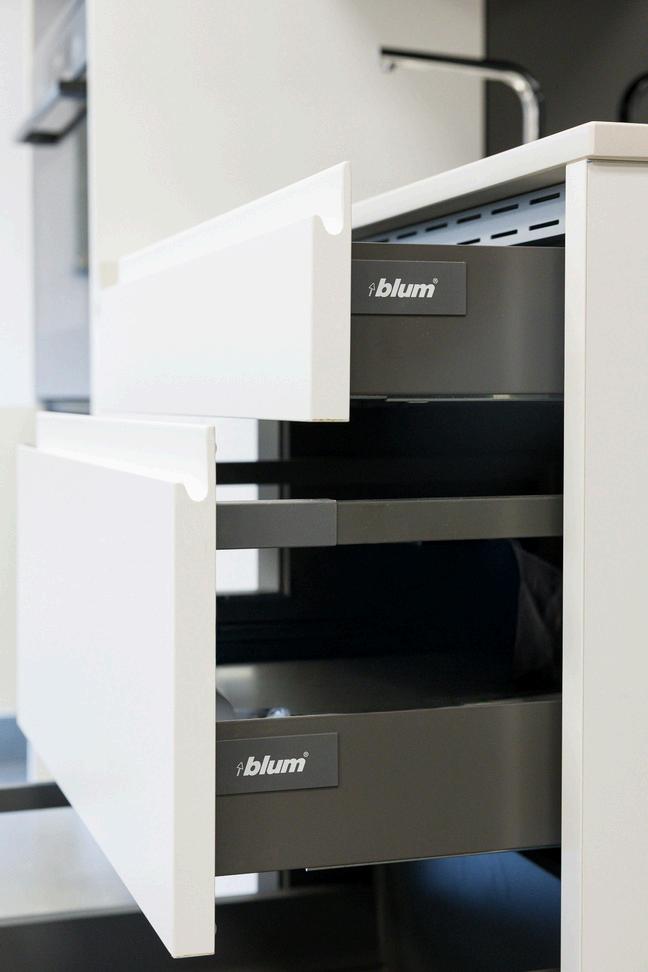 Kitchen equipped with wall and base cabinets. Drawers and doors with self-closing system Quartz composite countertop with undermount sink and faucet