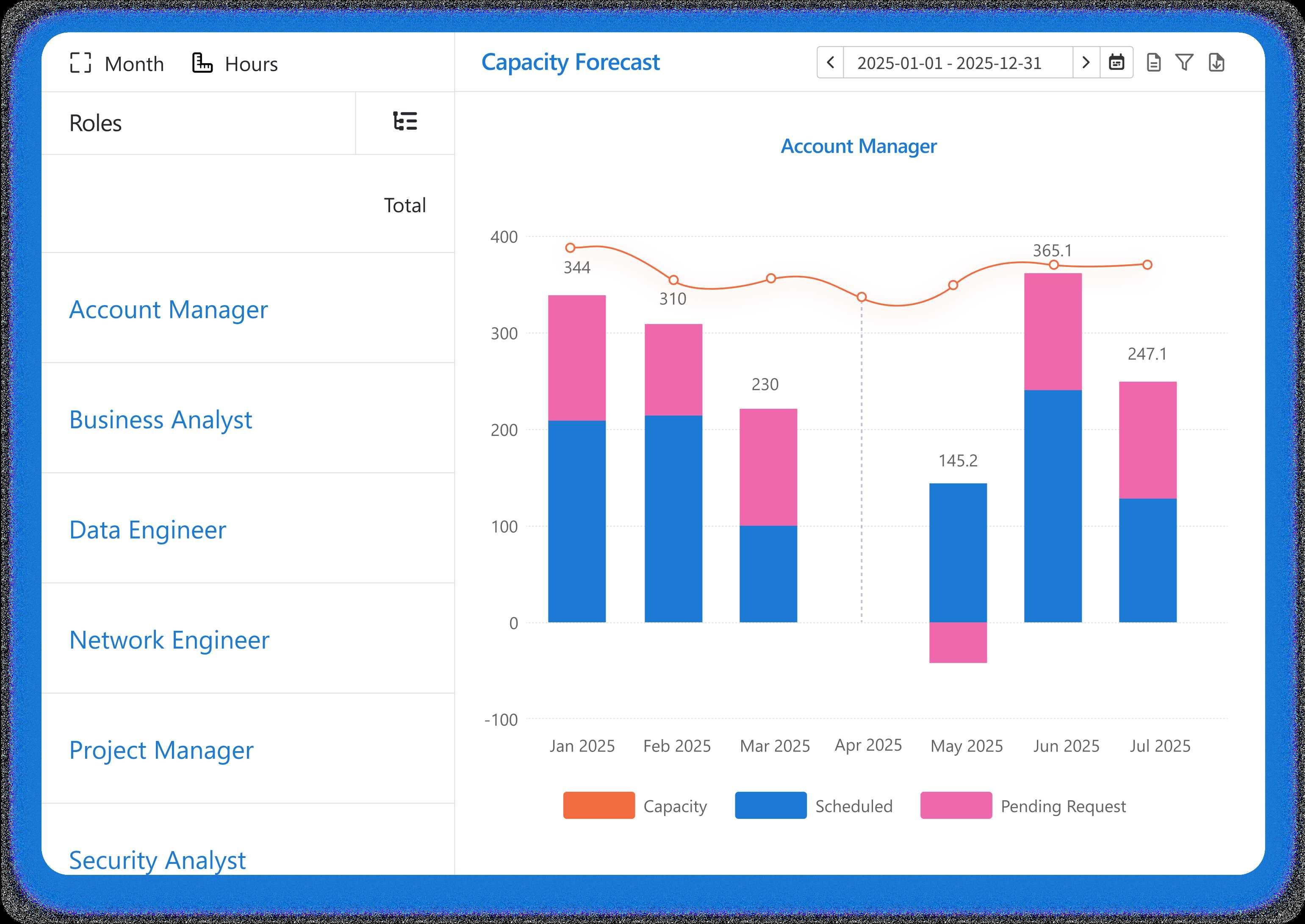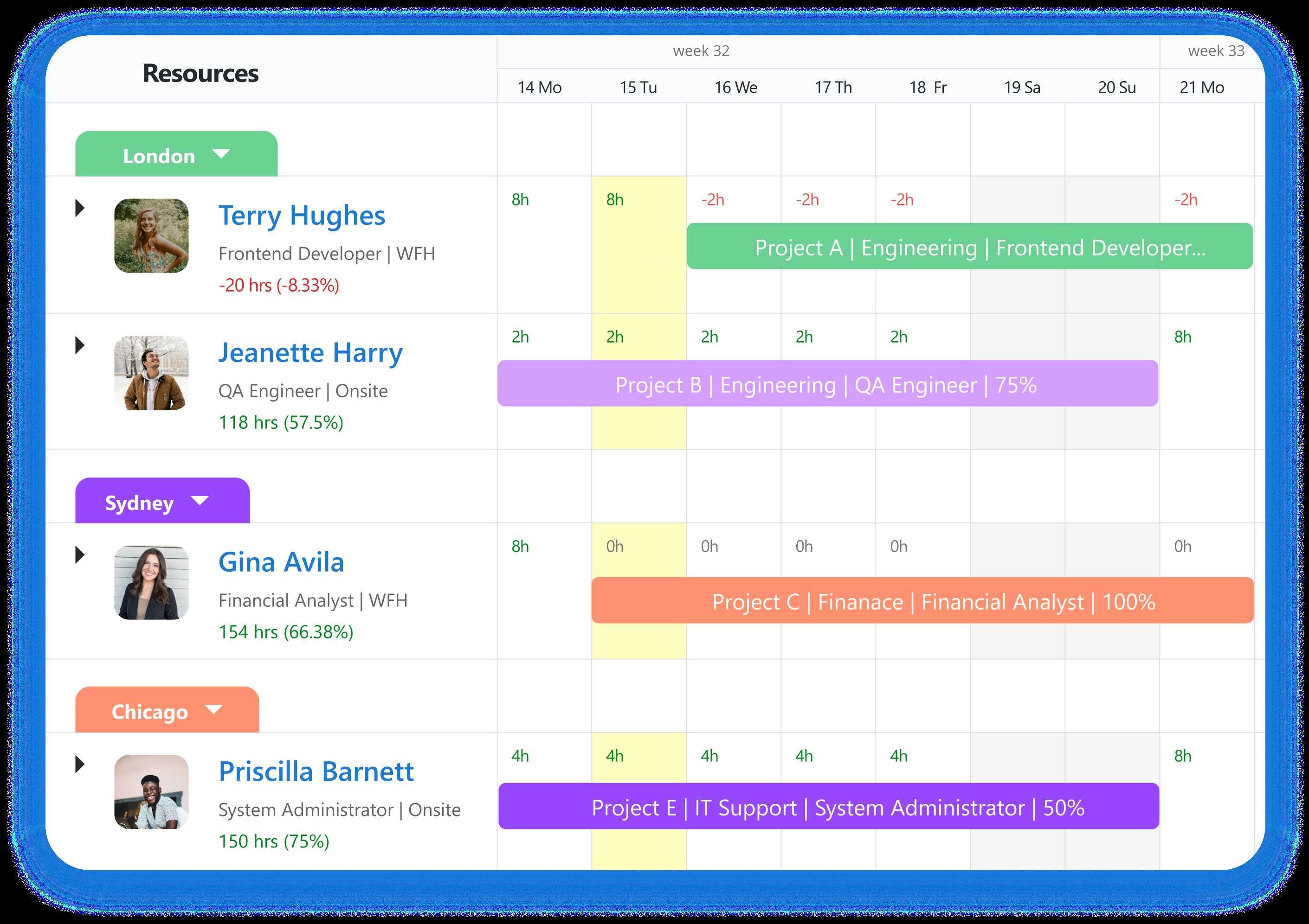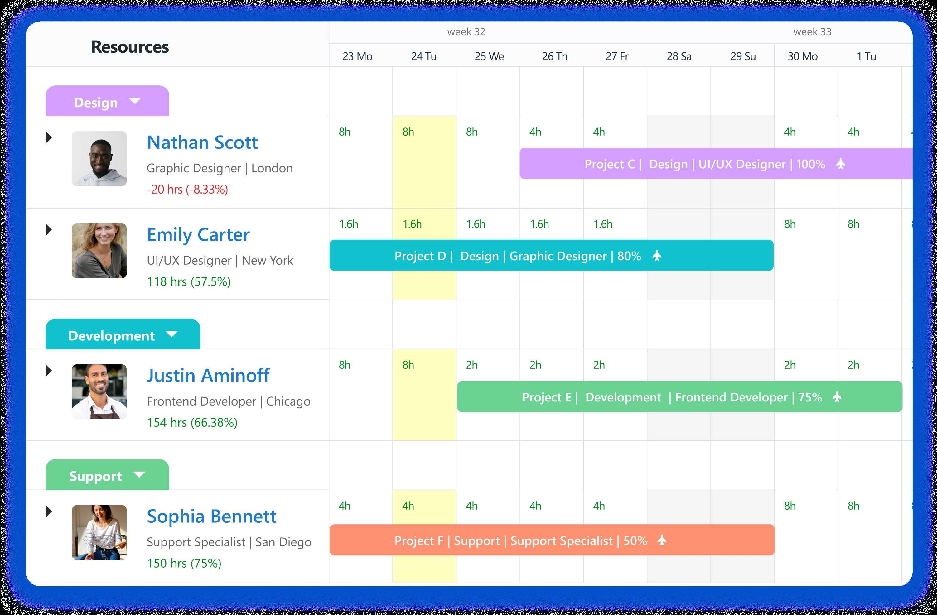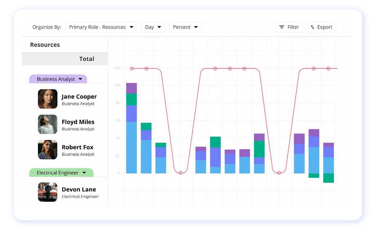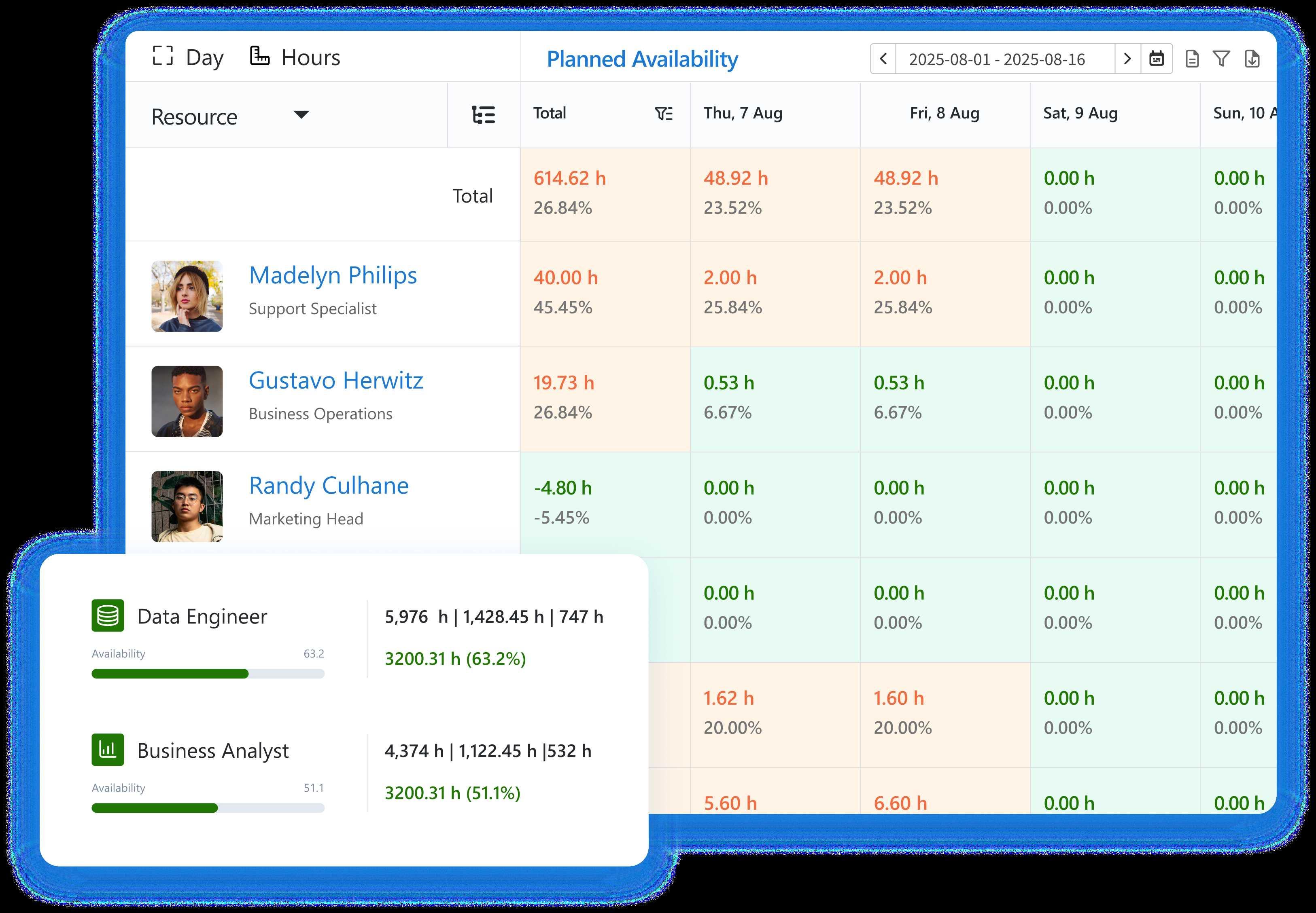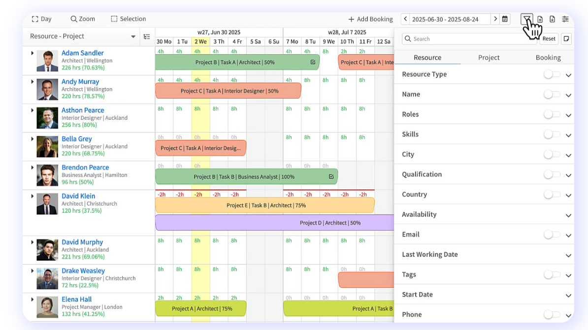 Filter resources by role, skill, or team to check availability and improve , ensuring perfect fit assignments. capacity planning