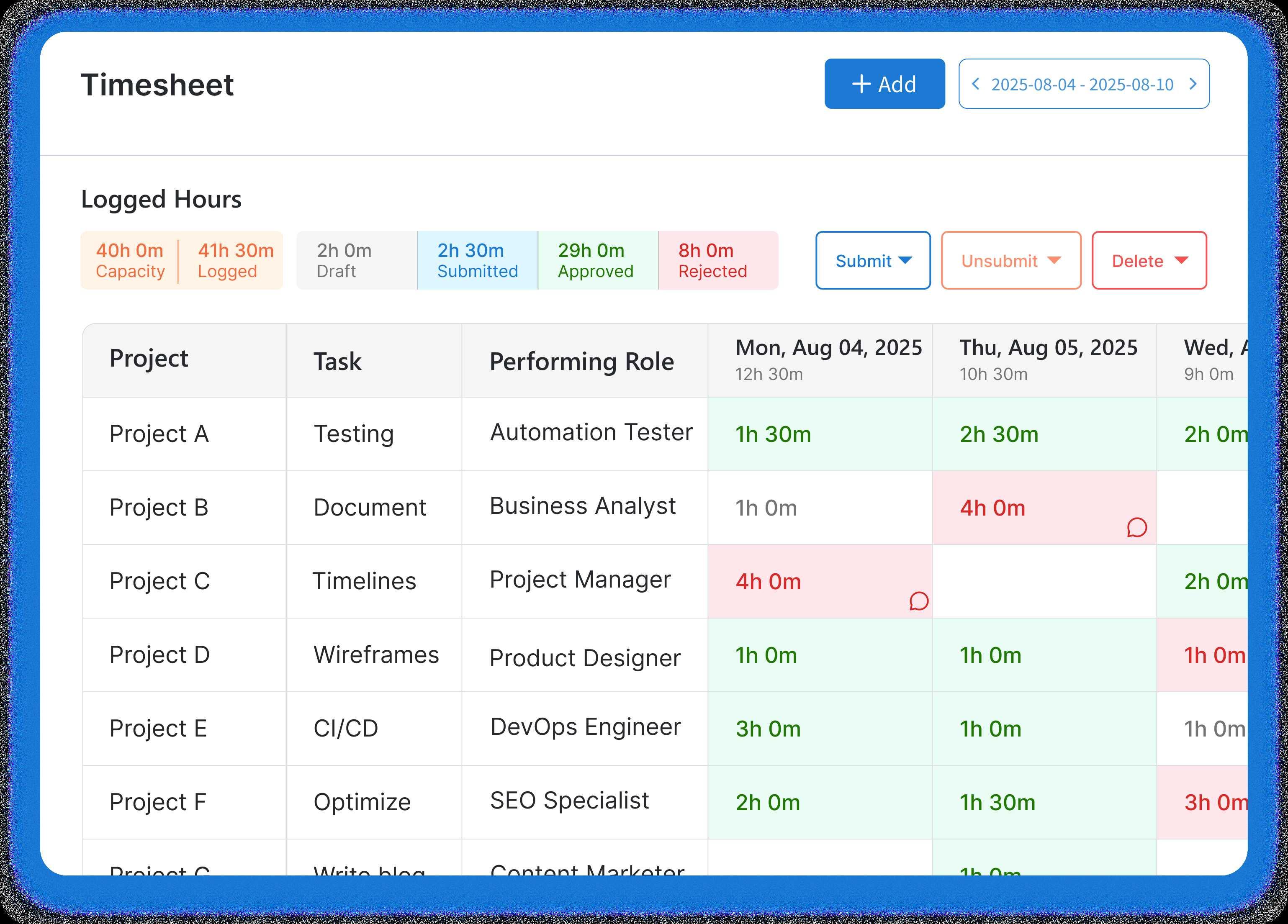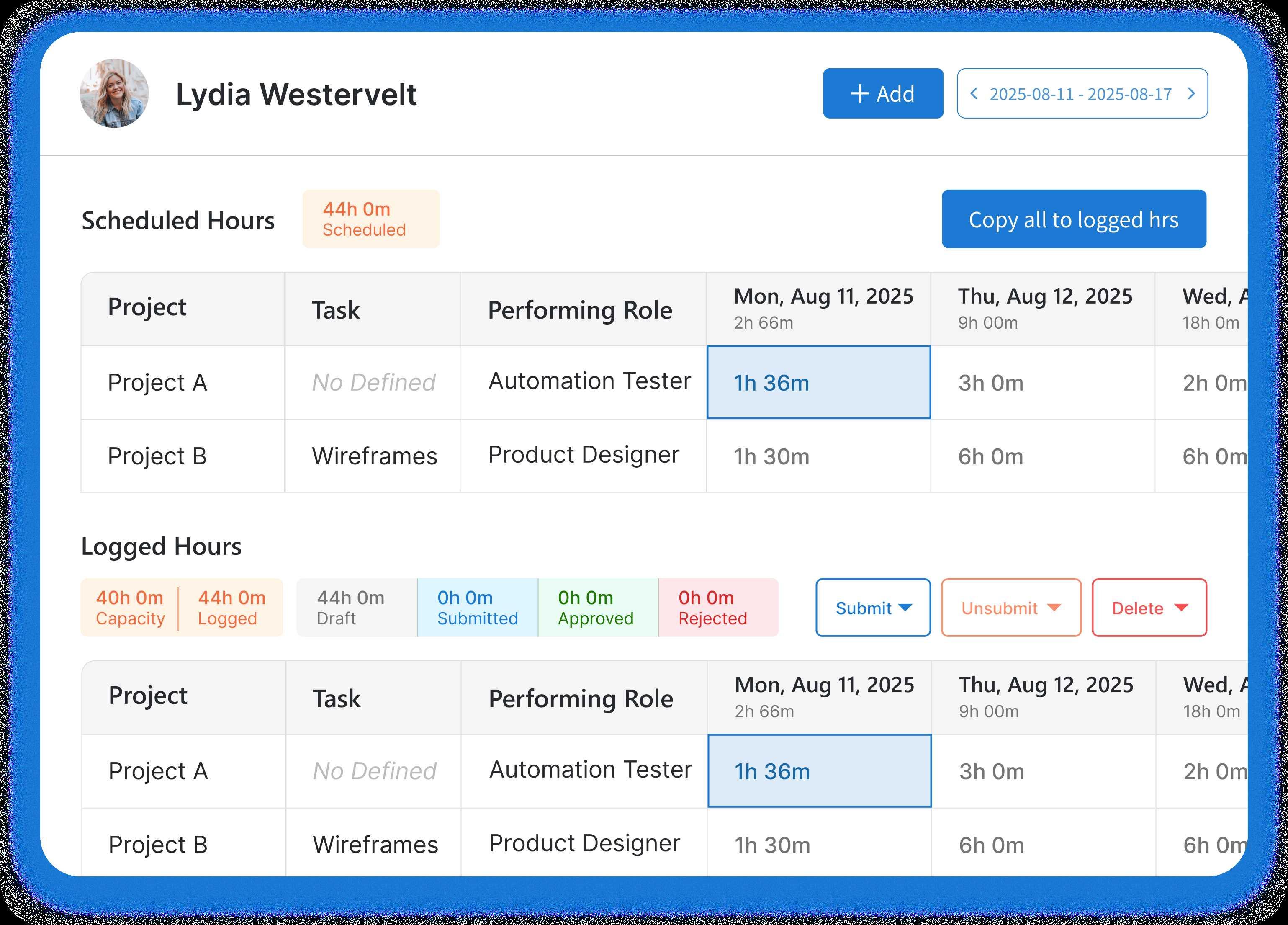 Planned hours automatically carry over to timesheets, letting your team simply record what actually happened.