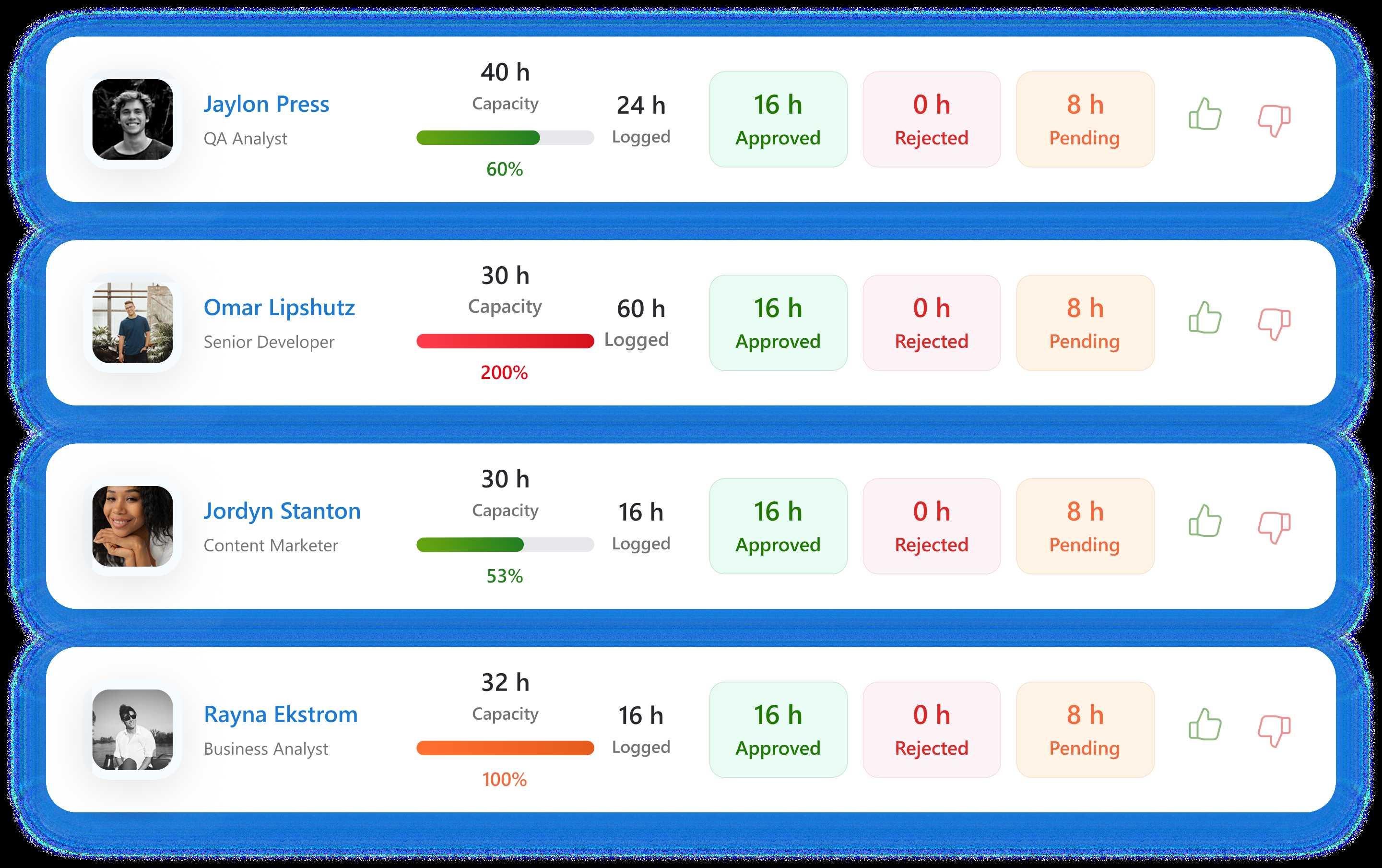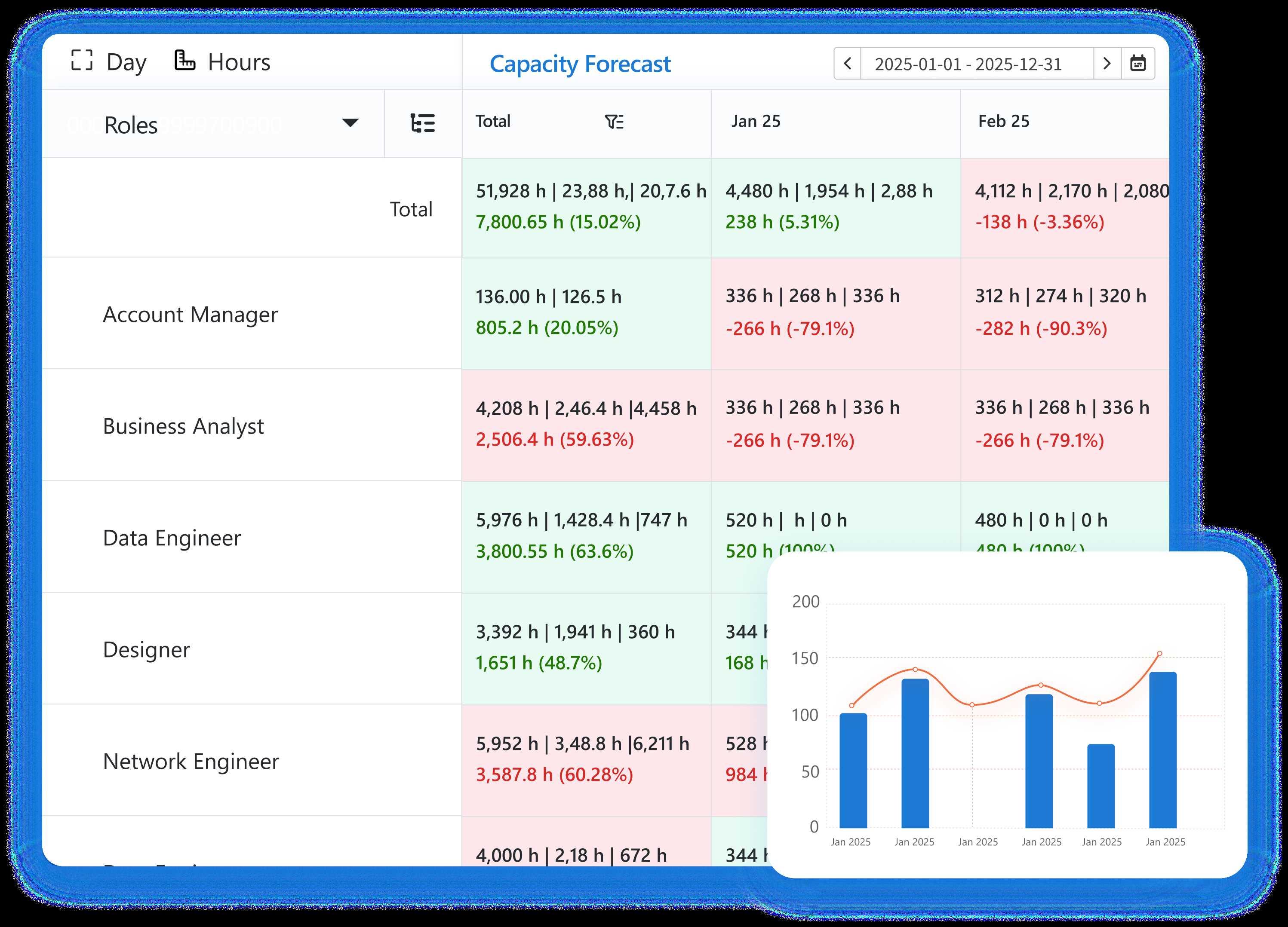 Spot resource gaps before they cause missed deadlines. Reassign, hire, or adjust priorities in time.