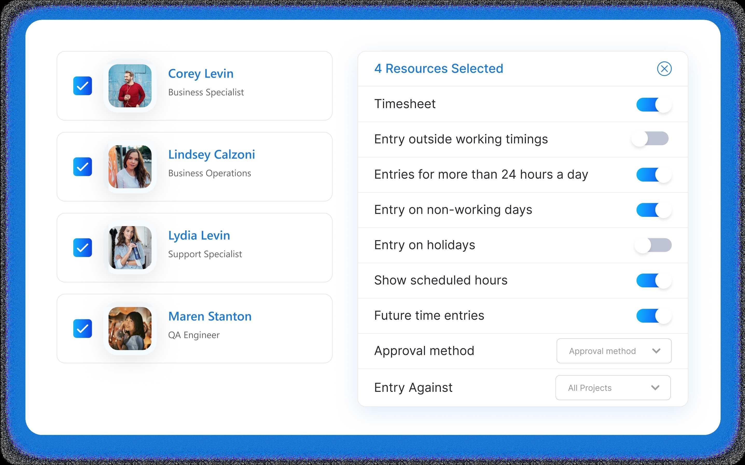 Configure your hours, policies, and approvals, and roll them out in bulk effortlessly.