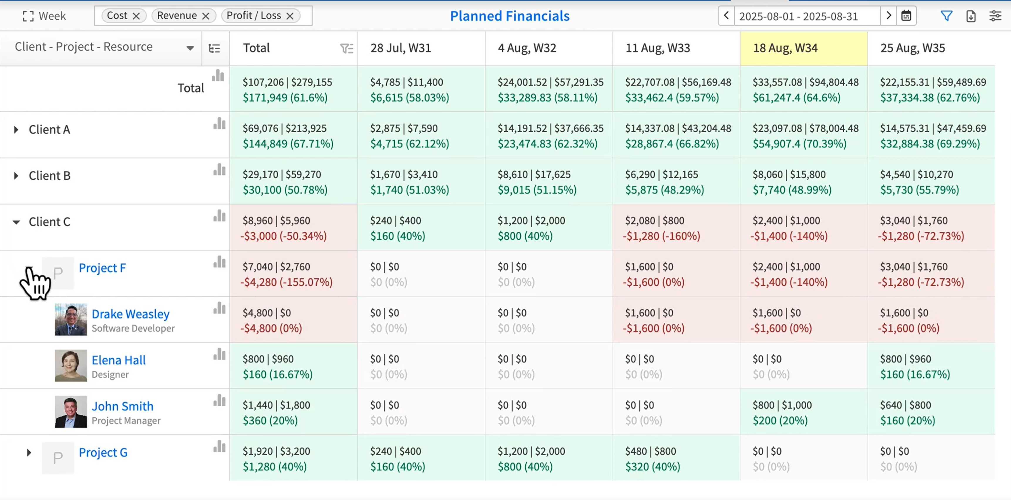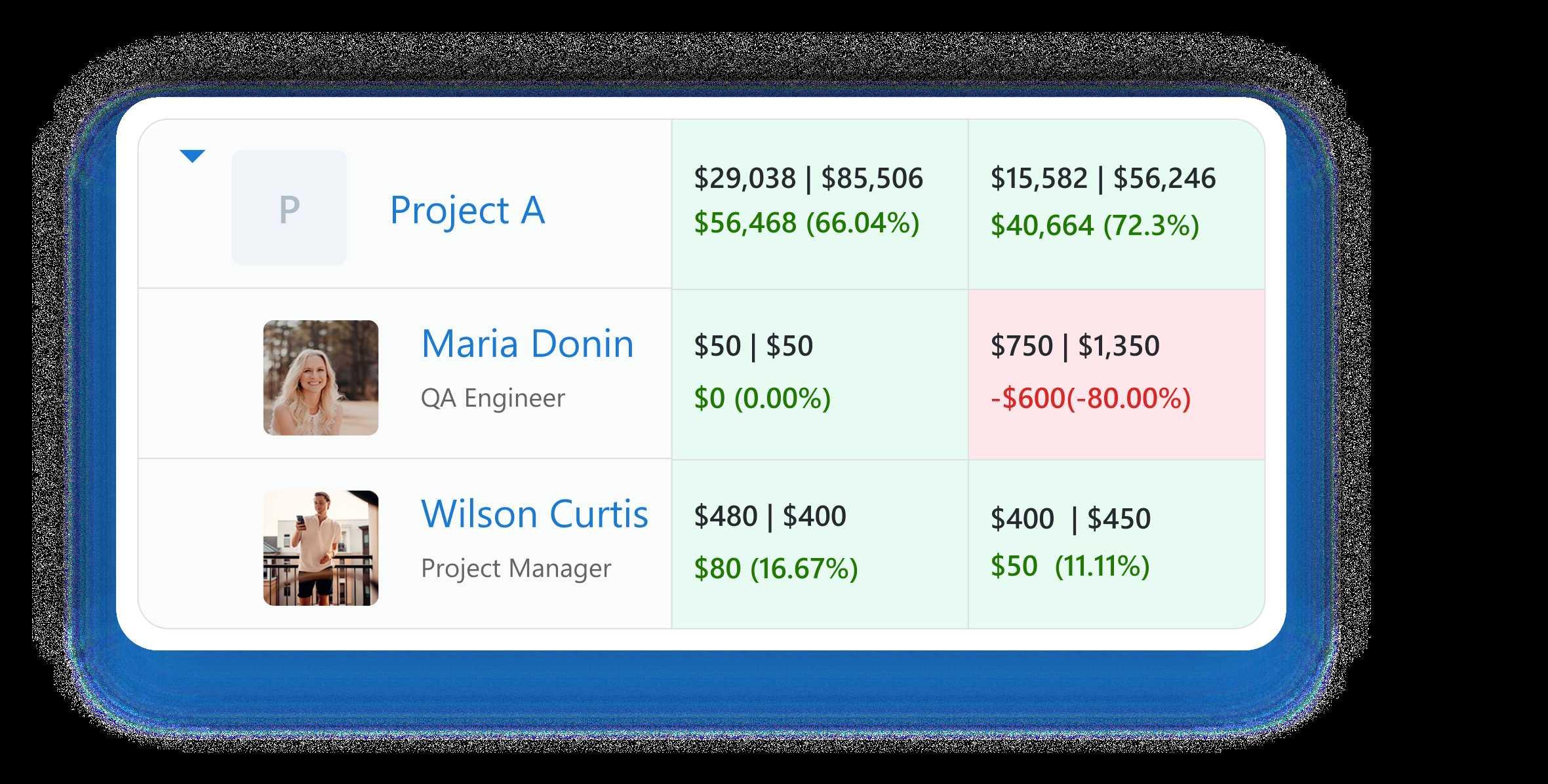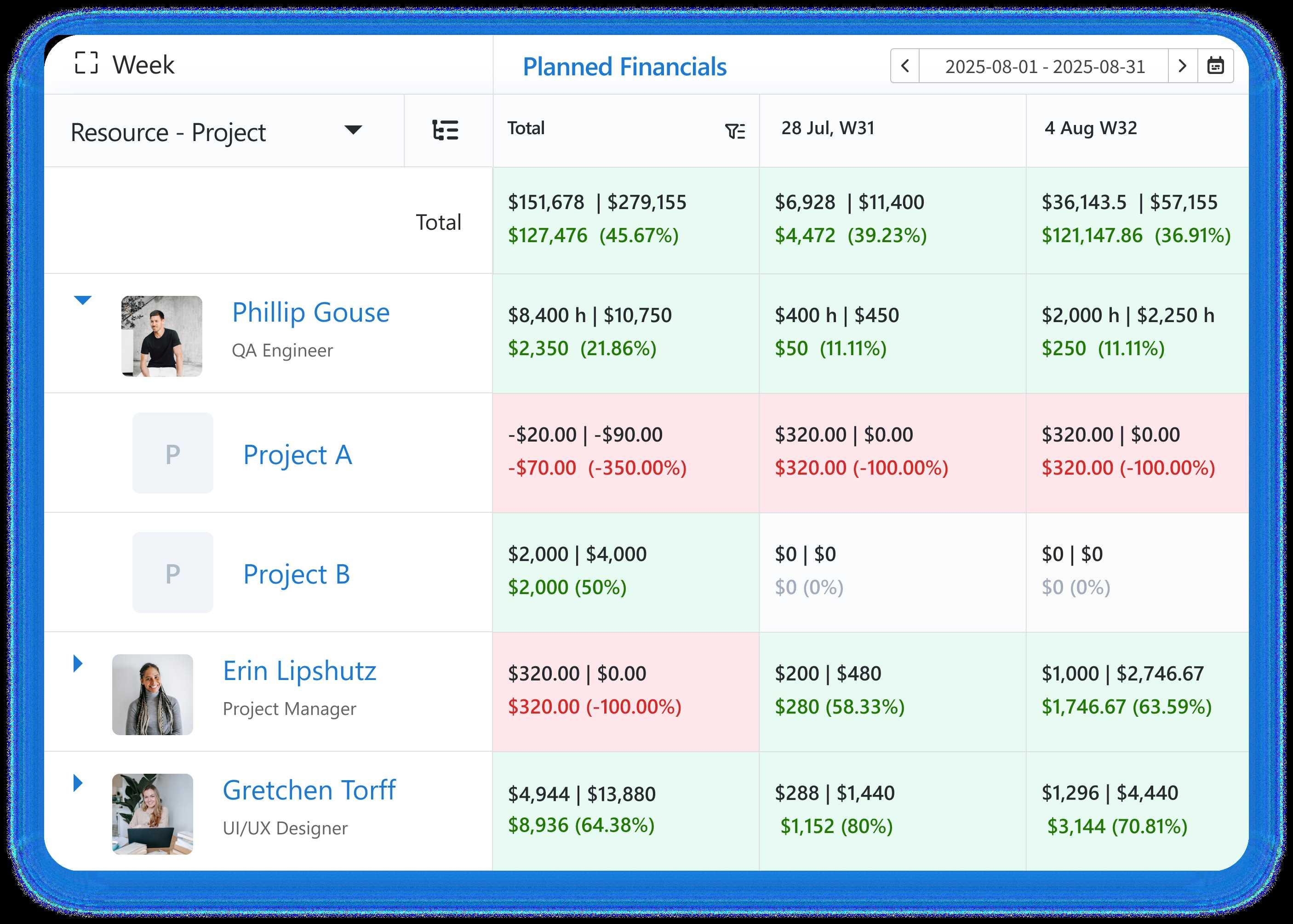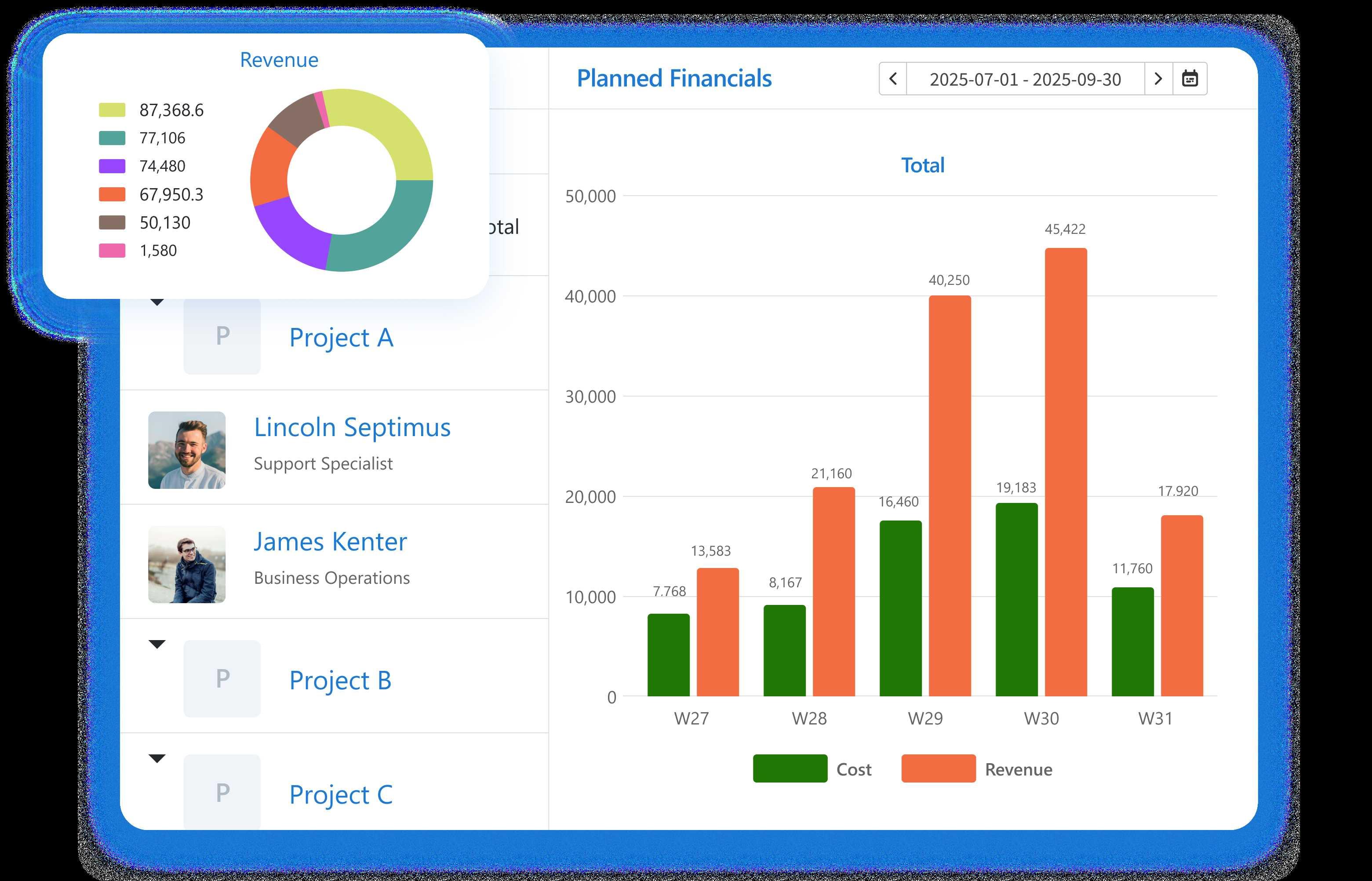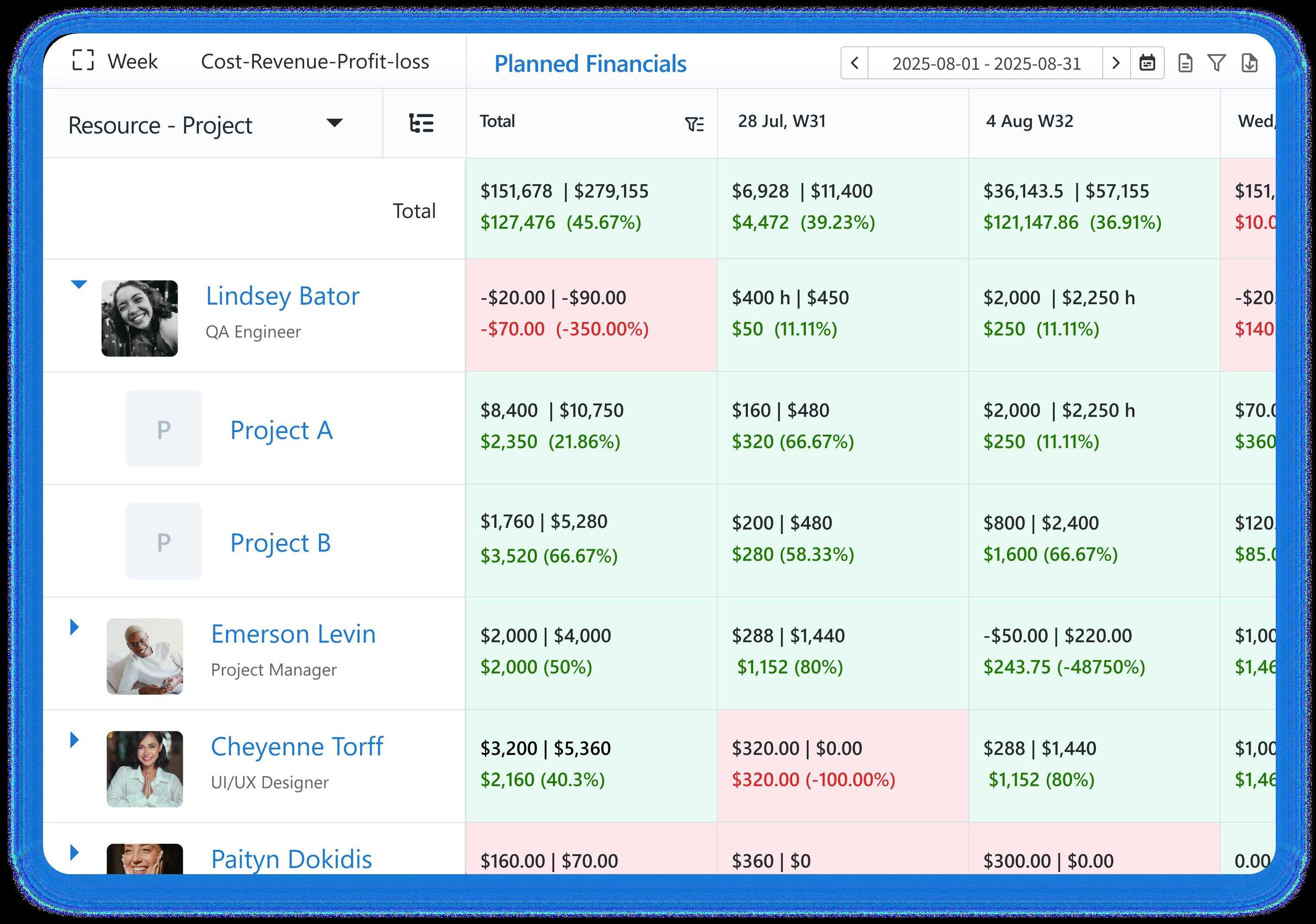 Keep cost, revenue, and profit aligned with how you allocate resources. Configure cost and billing rates by resource, role, or project, and access instant breakdowns for any client, manager, or team.