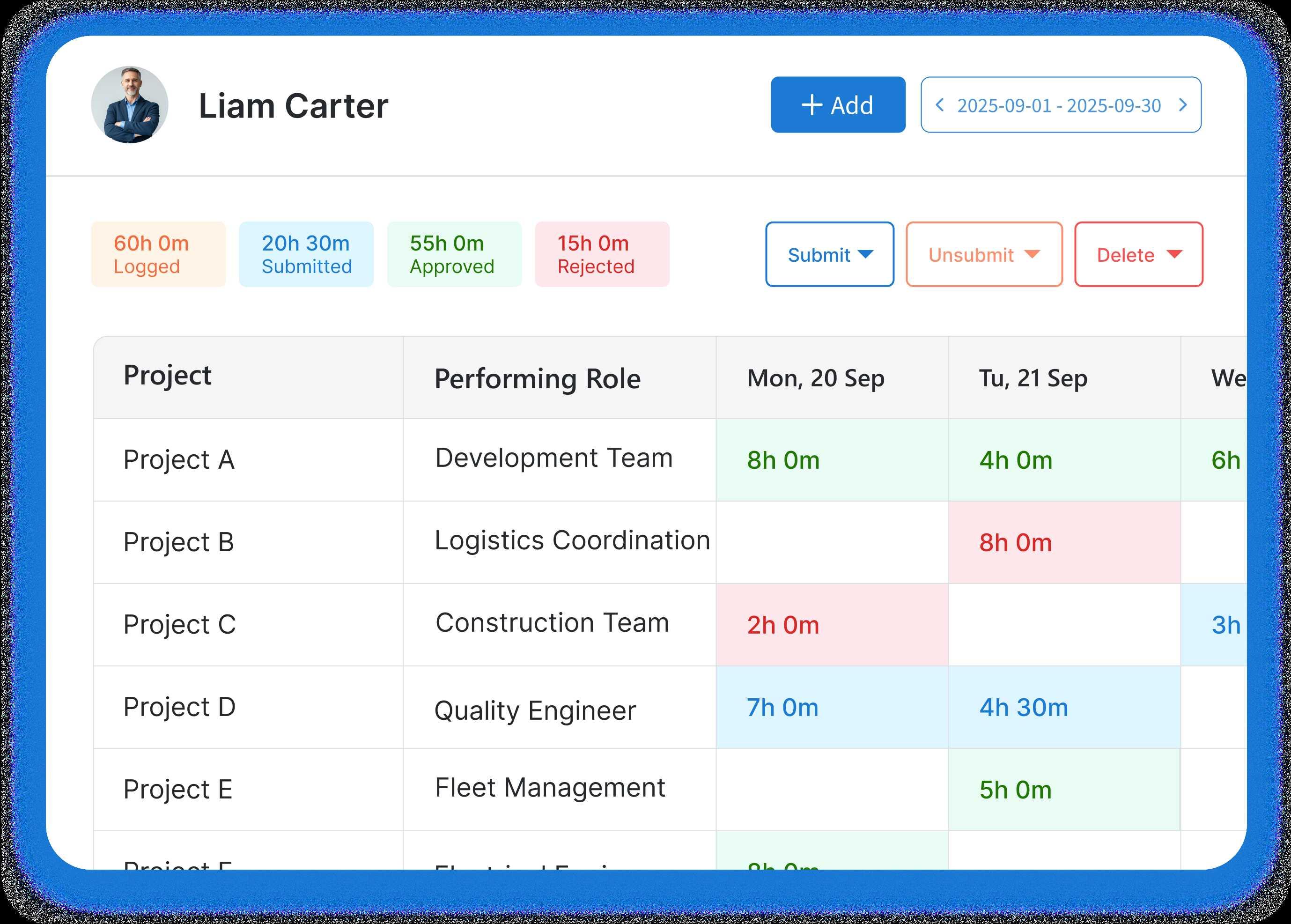Offer flexible logging with daily, weekly, or monthly views, and tie time entries directly to assigned schedules.