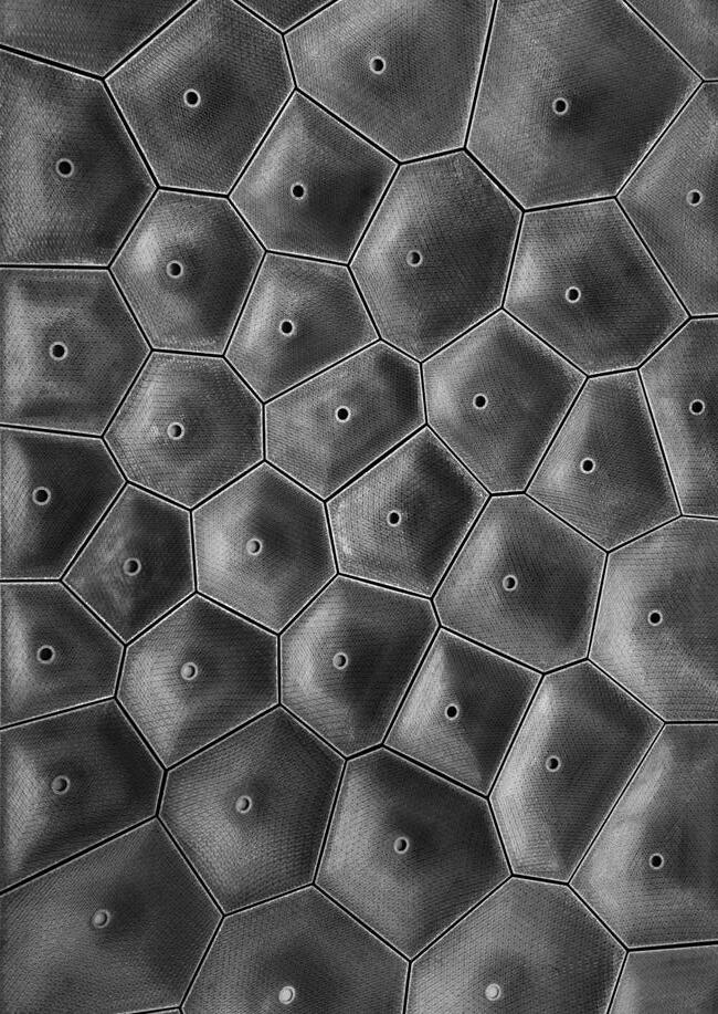The Kerfonic Wall is a 20′ x 8′ permanent artwork at San Francisco’s Autodesk Gallery. A family of discrete brick-like boxes is stacked with bolted connections to generate a Voronoi tessellation, overcoming sound-focusing effects when oriented in various directions. Over 54 custom-cut plywood boxes were distributed irregularly throughout the wall, acting as frames for kerf-cut hyperboloid panels. Flat plywood sheets were used to make such panels. They were transformed into double-curved freeform surfaces with varying degrees of flexibility by a set of kerfs.
