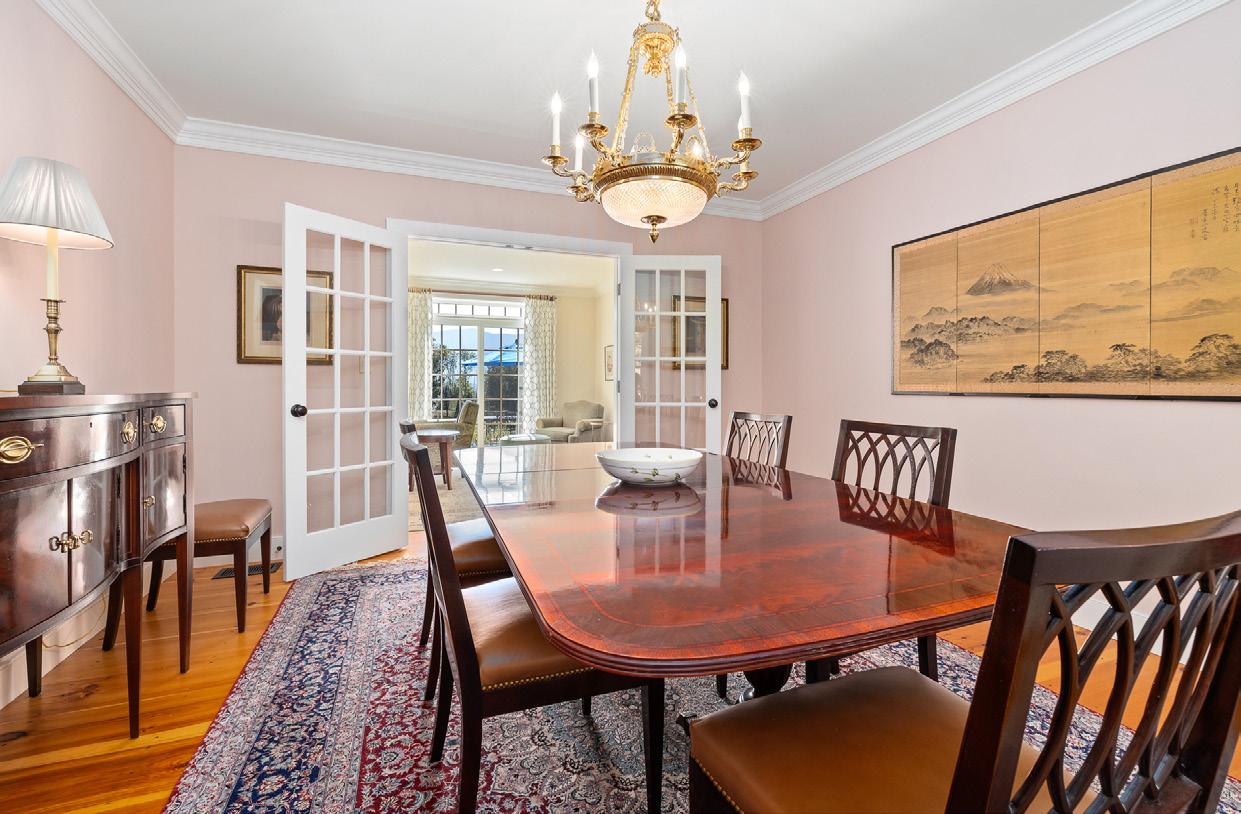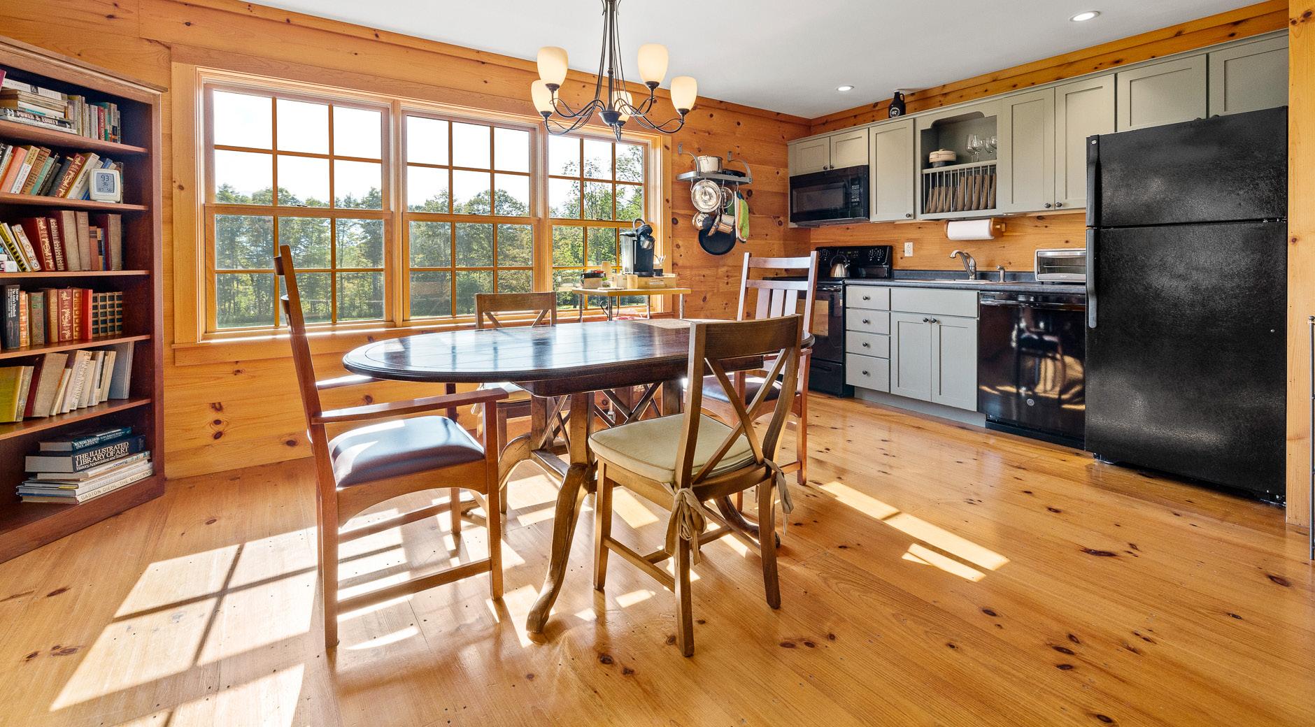Formal dining room opens to living area with wide pine floors, fireplace, walls of windows and sunny exposure.