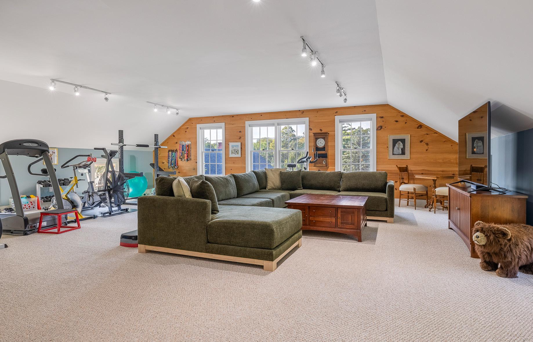 The second floor, with en suite primary, additional bedrooms and oversized media room also doubles as an in house work-out space.