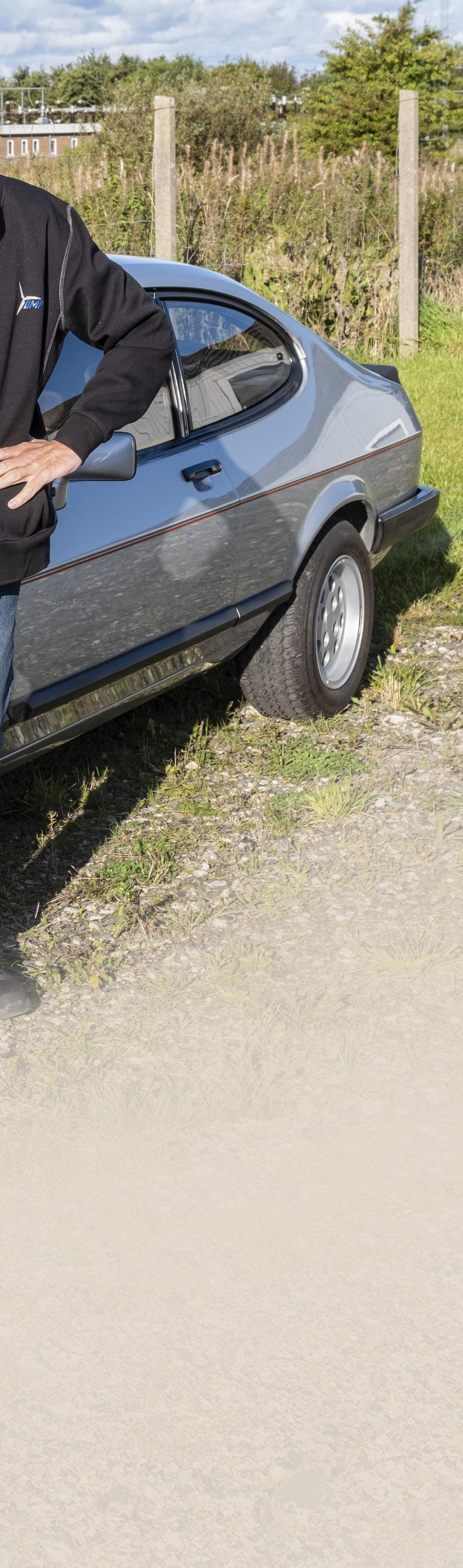 Blandt flere flotte køretøjer – hvoraf langt de fleste bærer familienavnet Ford –brænder den sjældne Capri fra 1982 igennem.