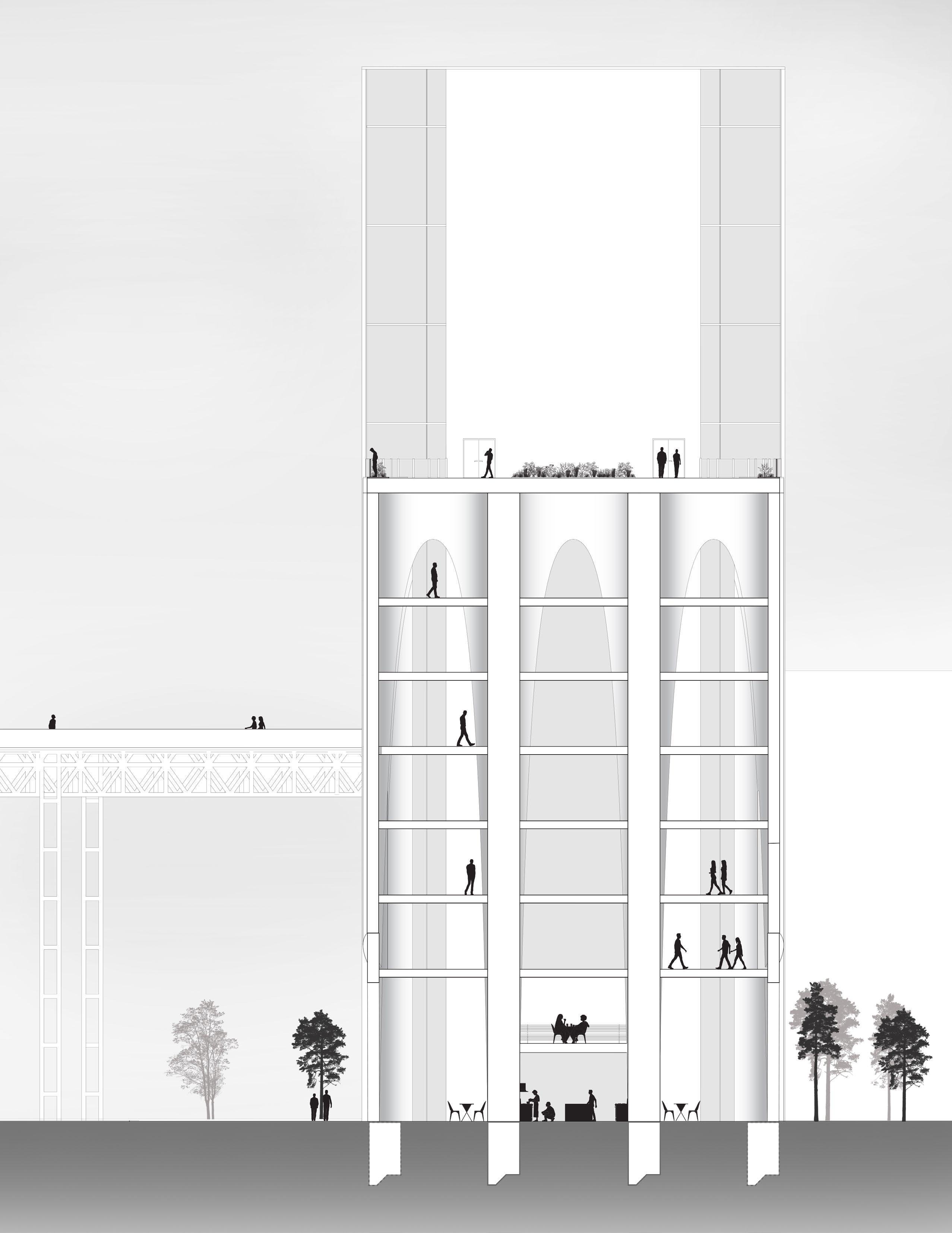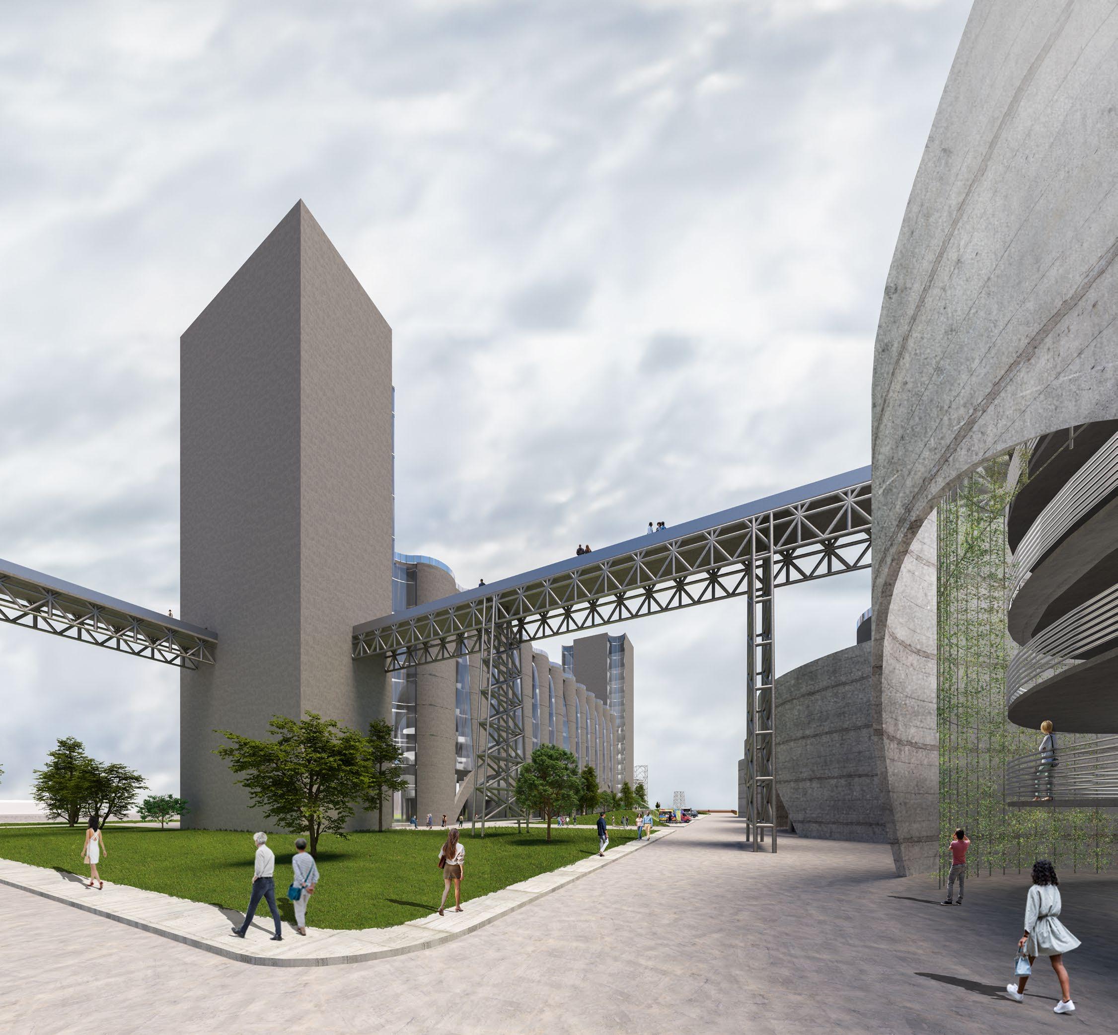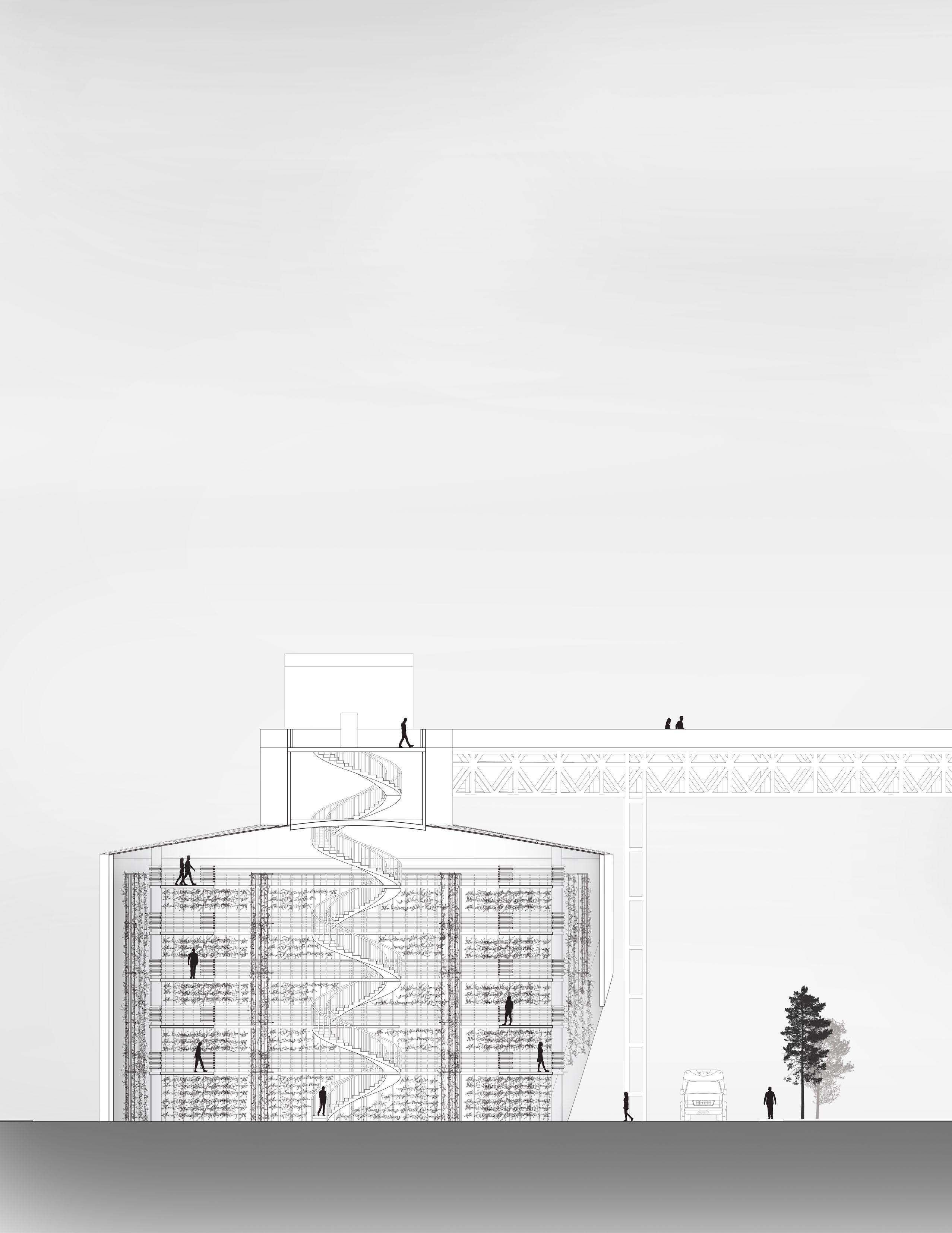 With the educational circuit that navigates you through the site, it allows the public to experience a unique cultivating food process known as vertical farming which can grow various types of food such as strawberries, grapes, cucumbers, lettuce, peppers, spinach, and many more. To make the most use of the space, I included a spiral staircase that allows the public to access it from the ground floor or the existing bridge, navigate