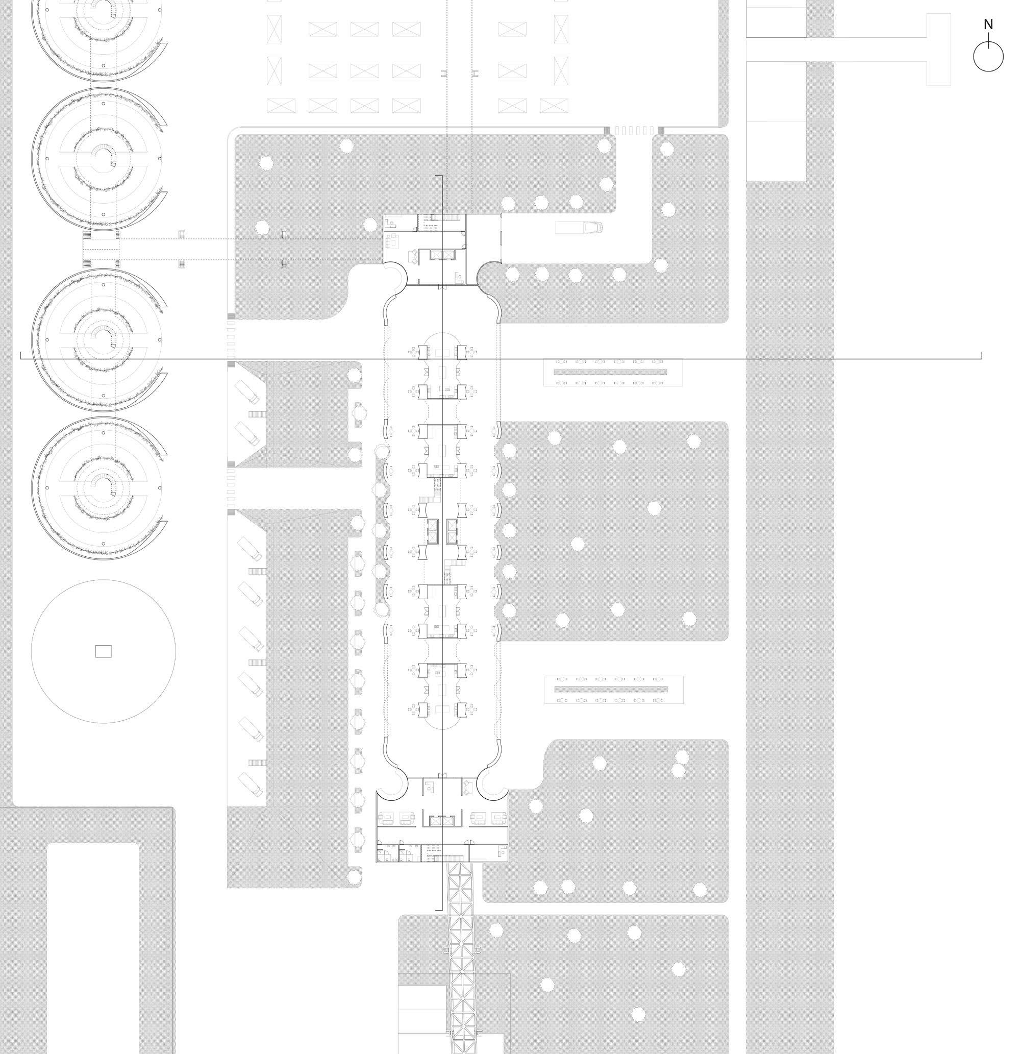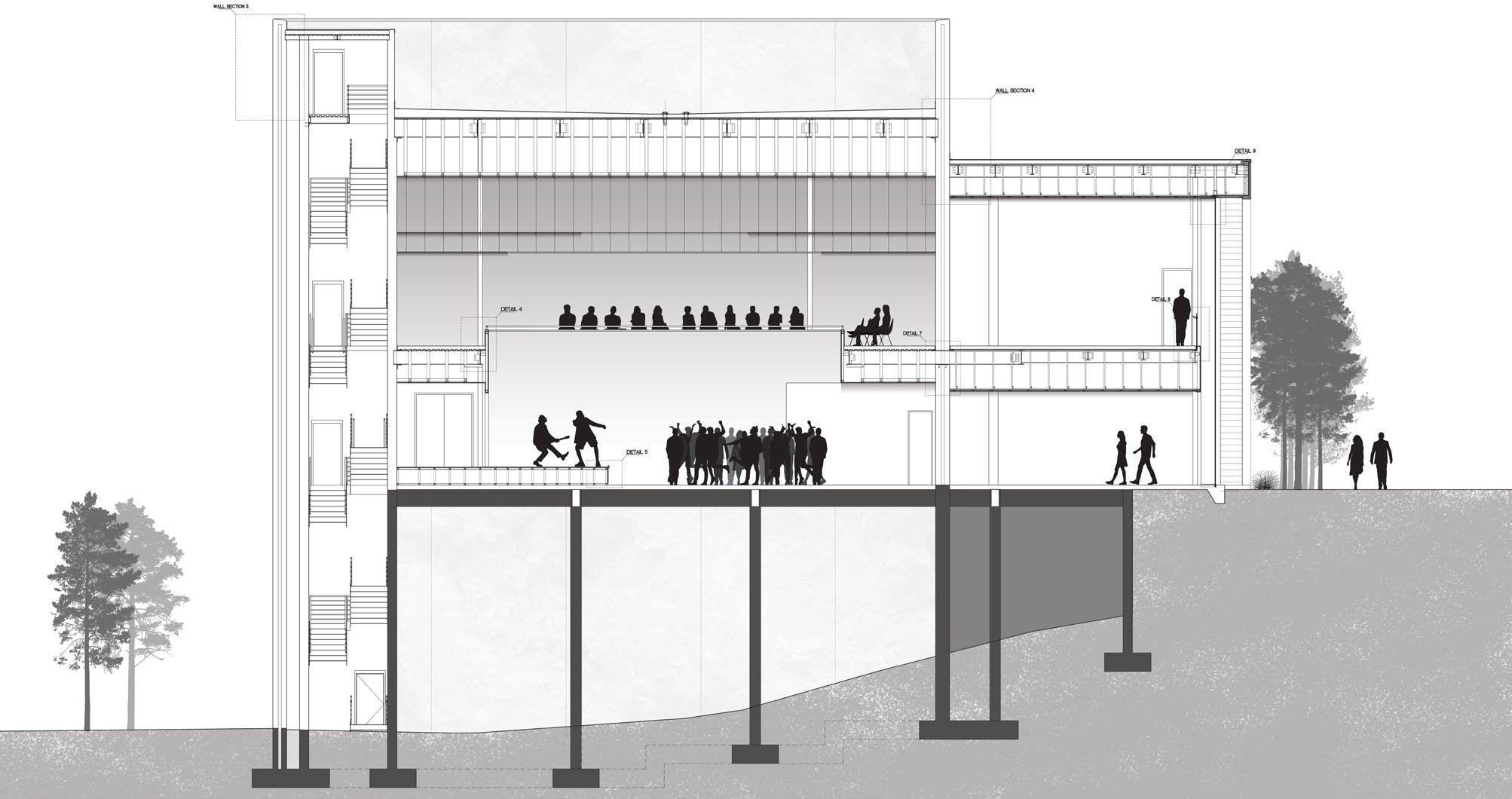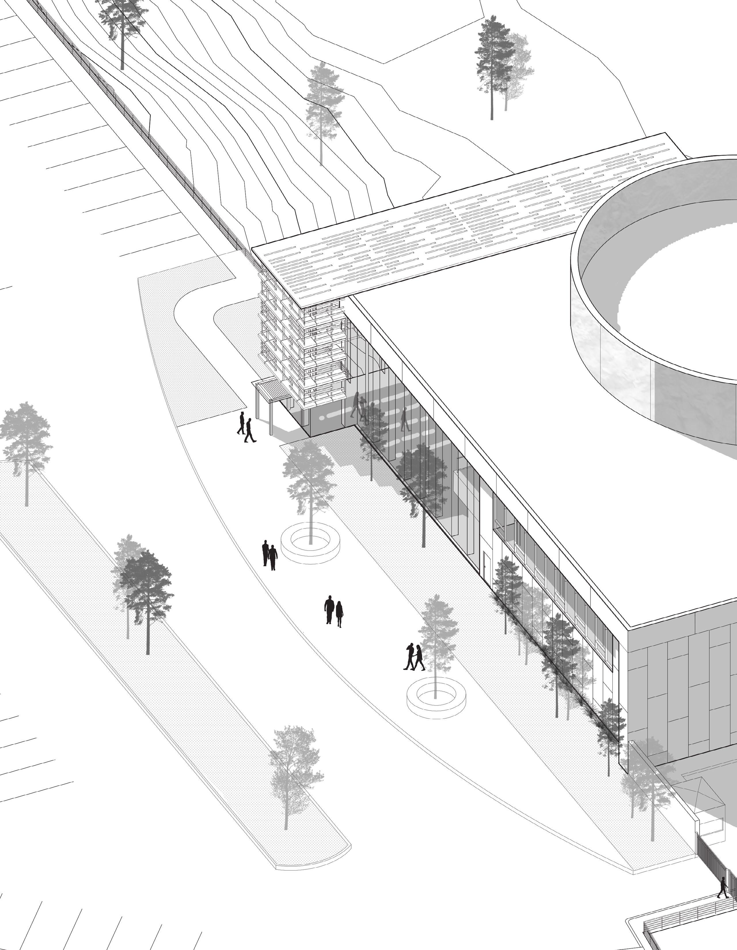 into the sports field. As all the activity is taking place within the eastern and bottom portion of the site, it allows for the still space to keep expanding upwards across the Drawing Institute into the student dorms located at the uppermost sector of the building.