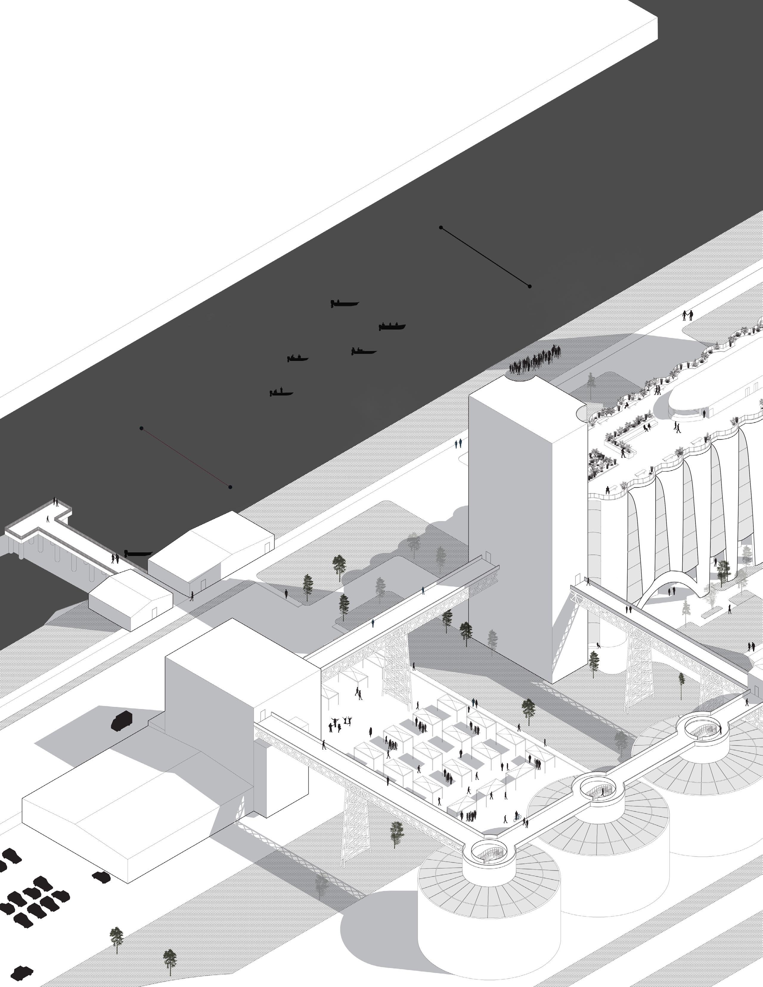 Due to this being an adaptive reuse project, I aimed to preserve most of the abandoned flour mill building as much as possible while still being able to provide various openings within the core of the building and be able to connect it to the many elements that surround it such as the neighboring supermarket, the various vertical vegetable gardens, and to the Port of Houston.