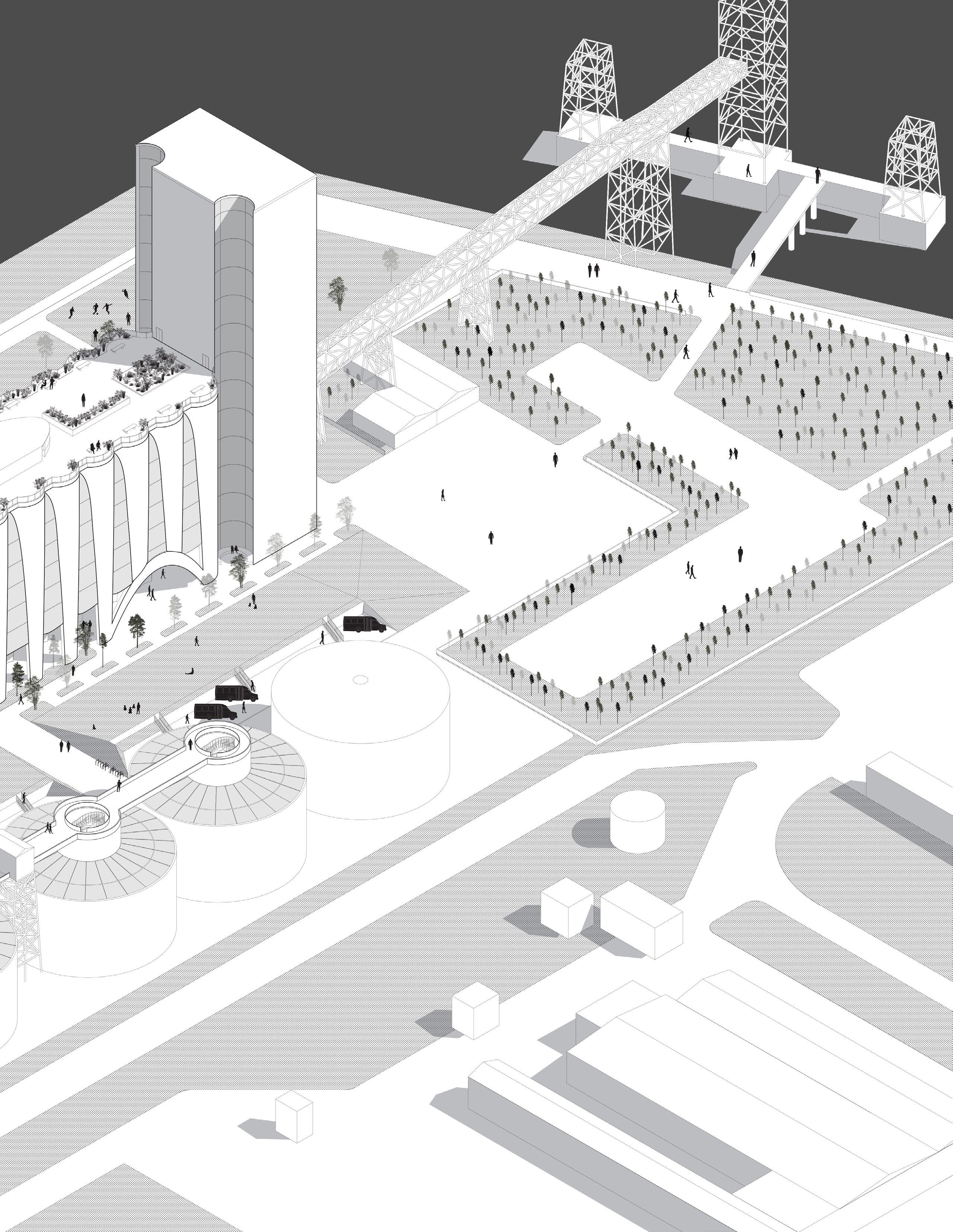 With designing an interactive site there needed to be a clear connection among the various program elements within the site. One approach was to create openings on both ends of the main building that allowed for a clear passageway from the Food Truck Hall to the Park and eventually the Port of Houston. However, there also needed to be a way to establish a connection at an elevated level. With the existing site already having a bridge that connects my main building to the neighboring storage tanks it inspired me to expand on the existing bridge and find a way to connect it to the neighboring building a supermarket and transform it into an educational circuit that navigates you through the various steps of the food making process