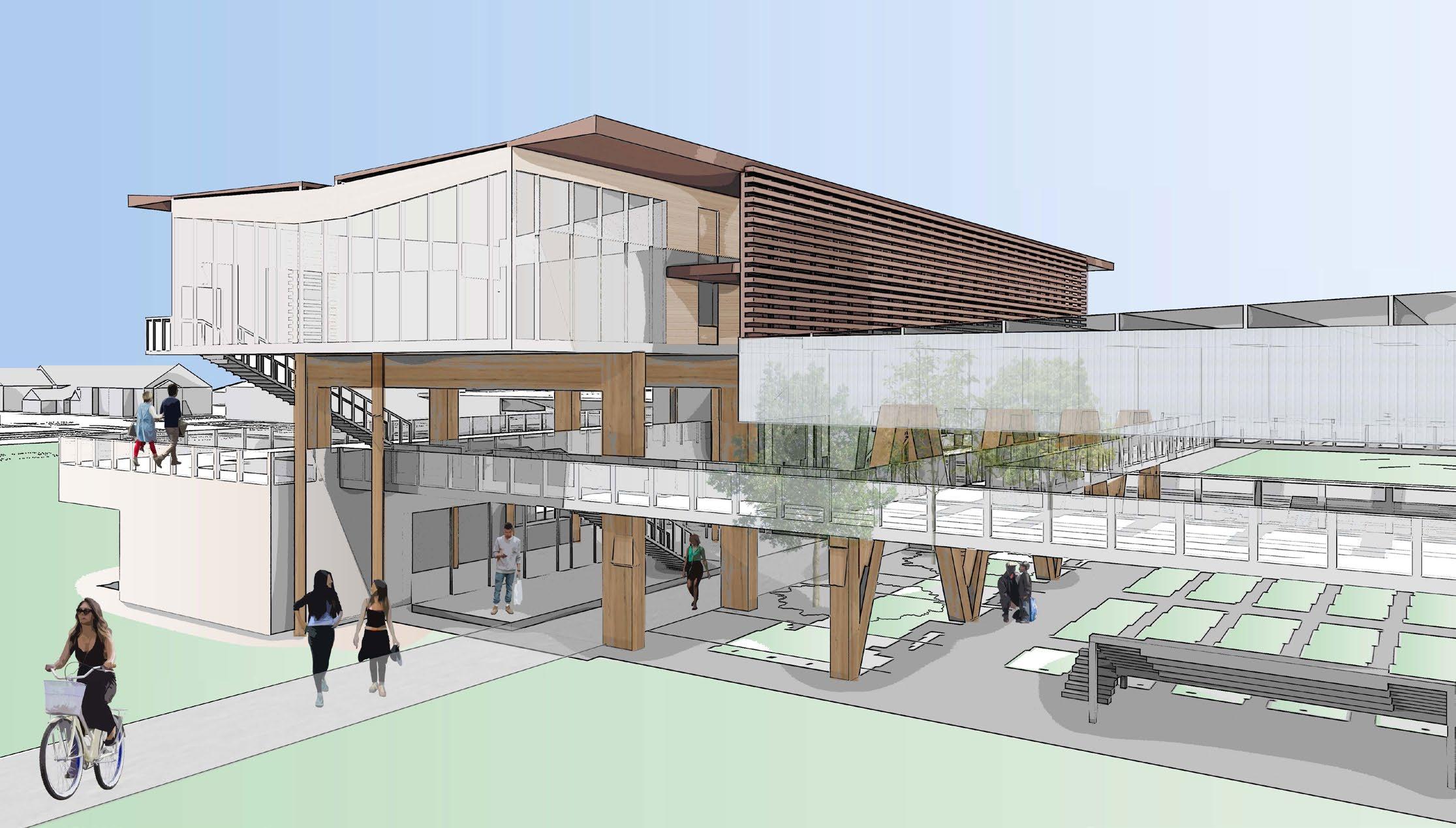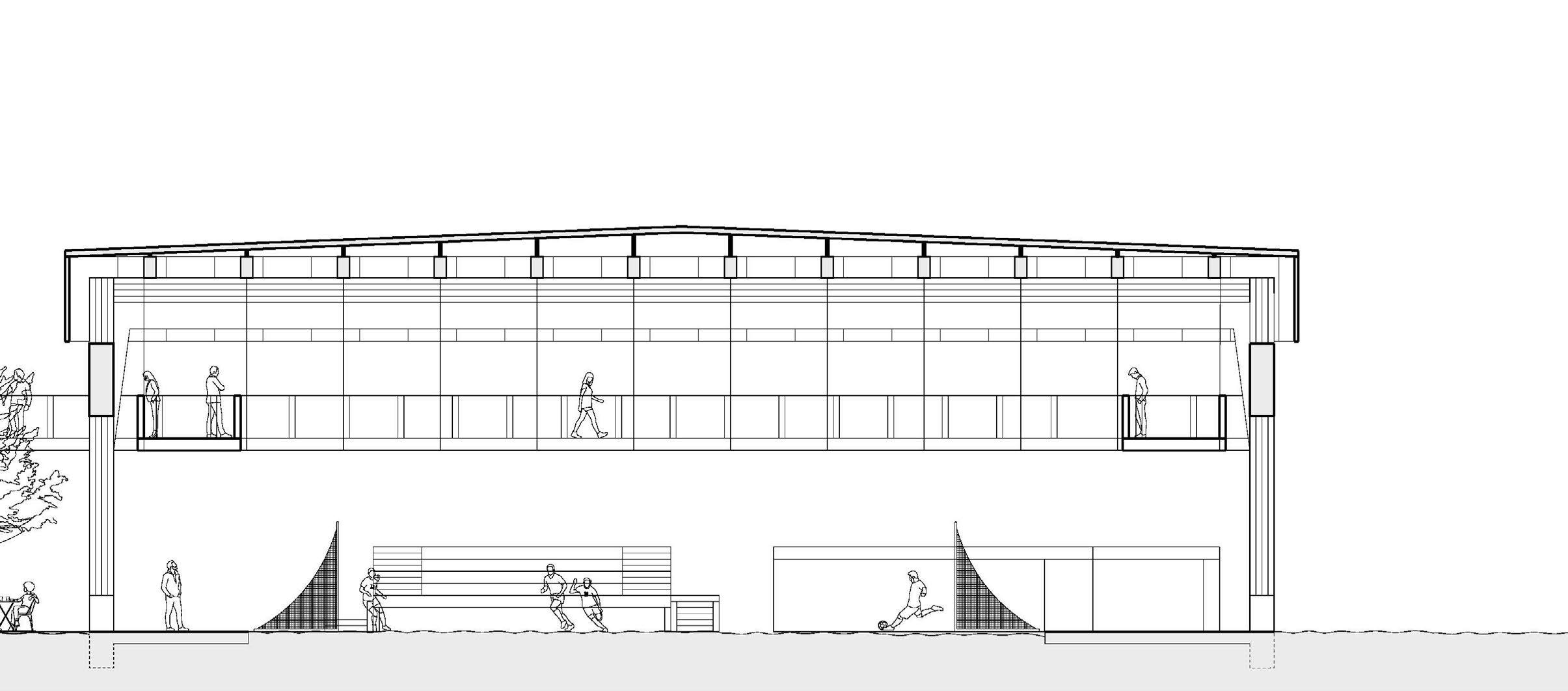 With a polycarbonate roof and screen covering up the sports field, it allows for the mass timber structure to be seen from a distance and invites the public to observe the structure more closely.