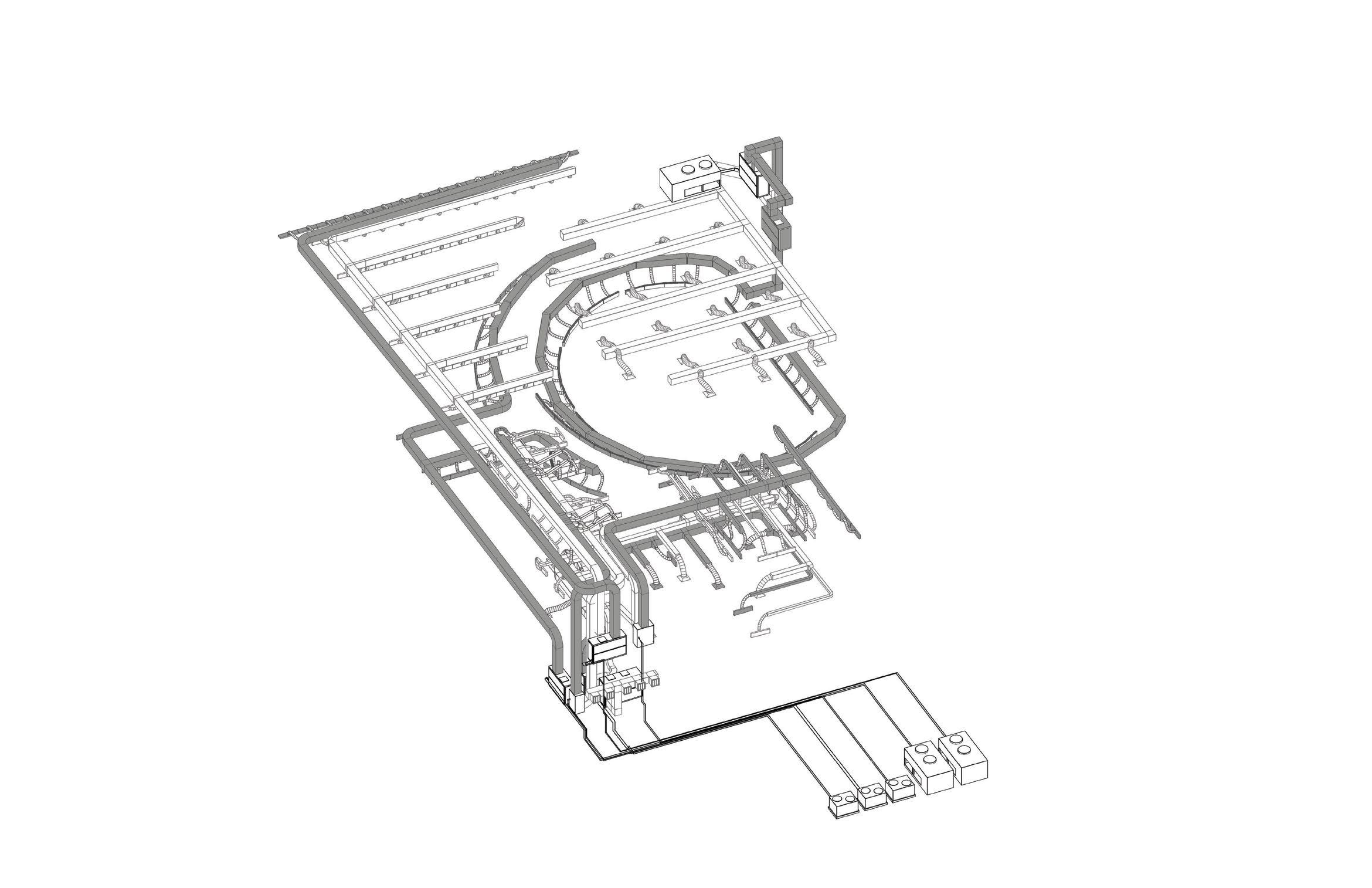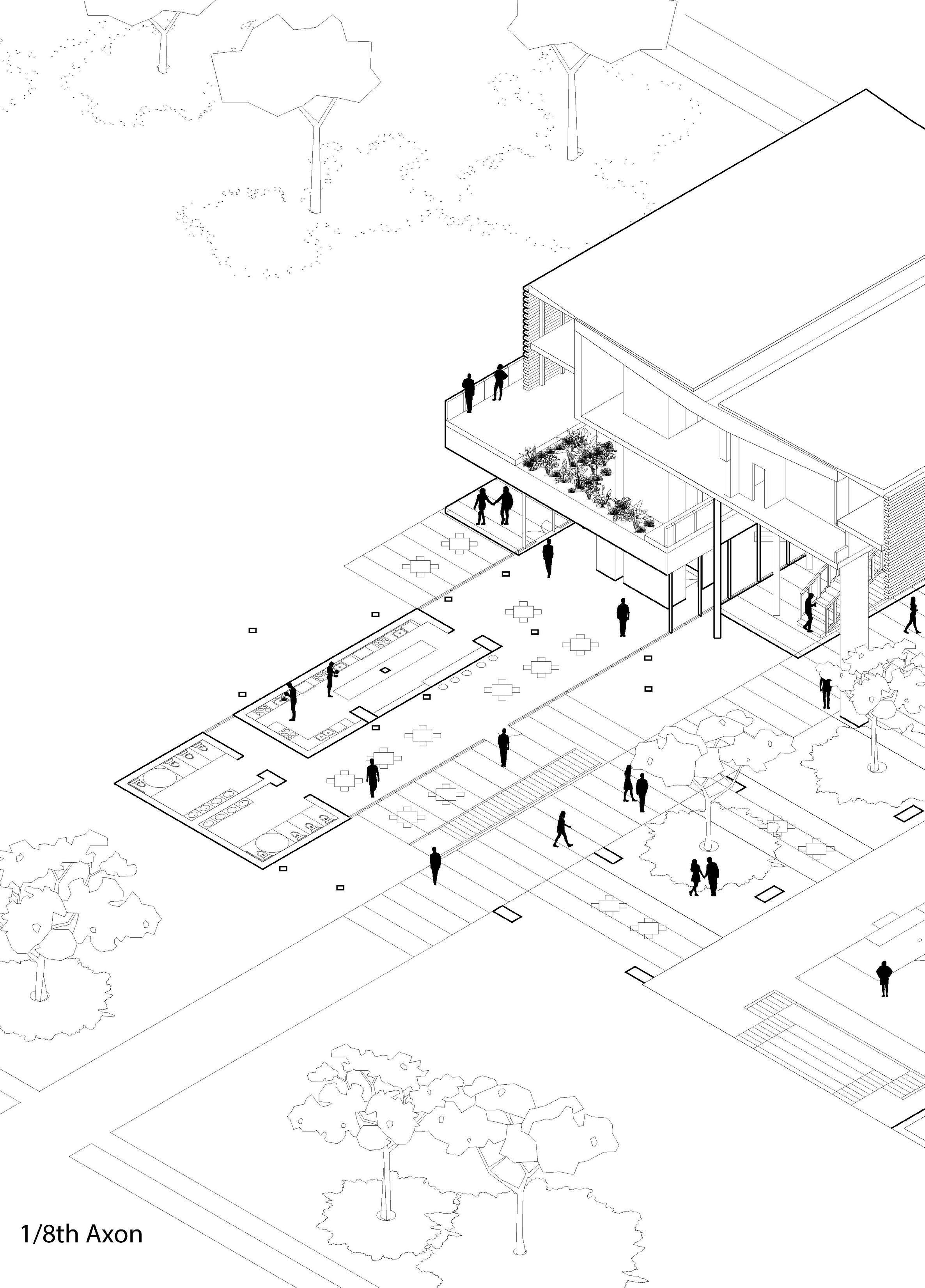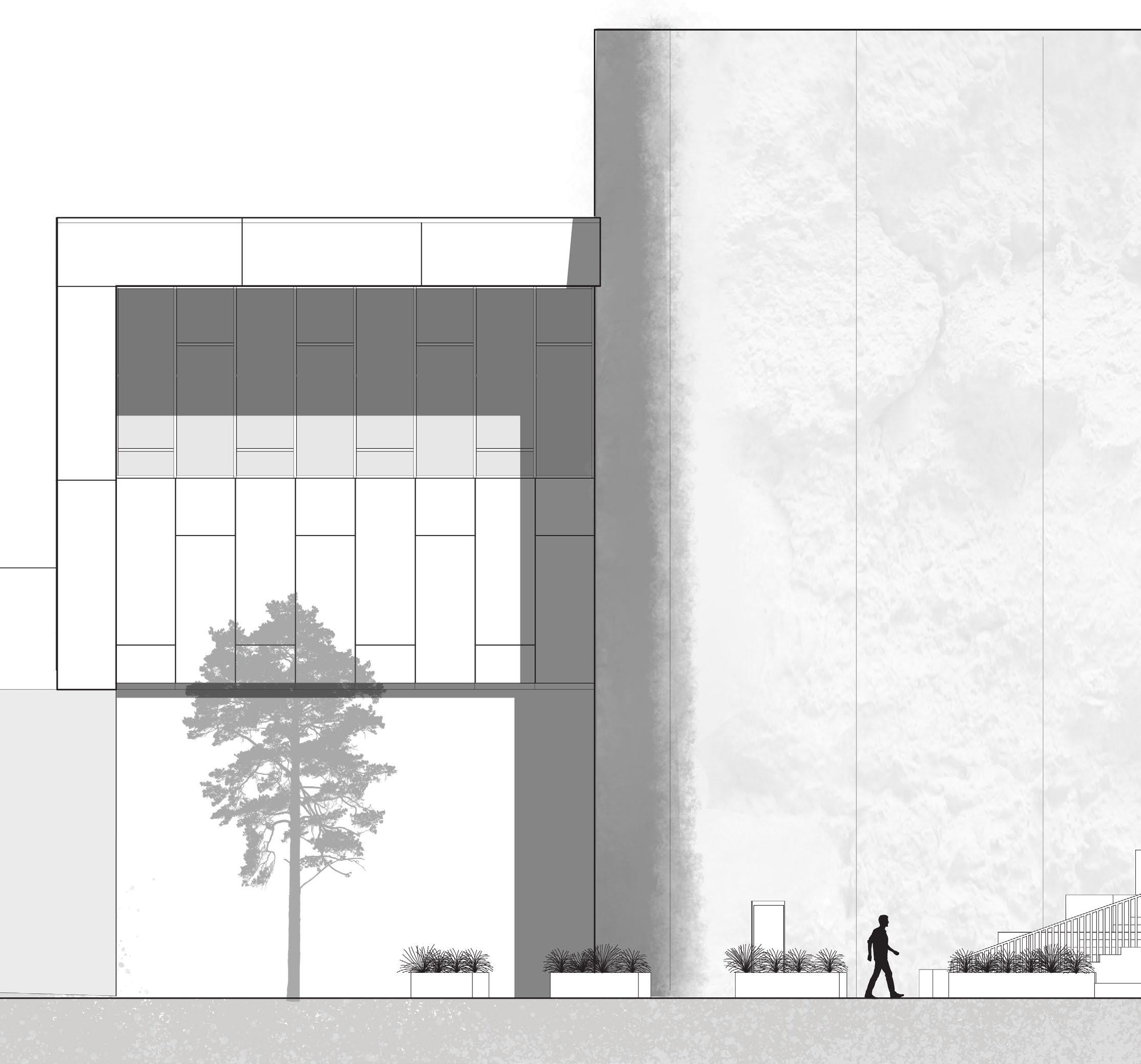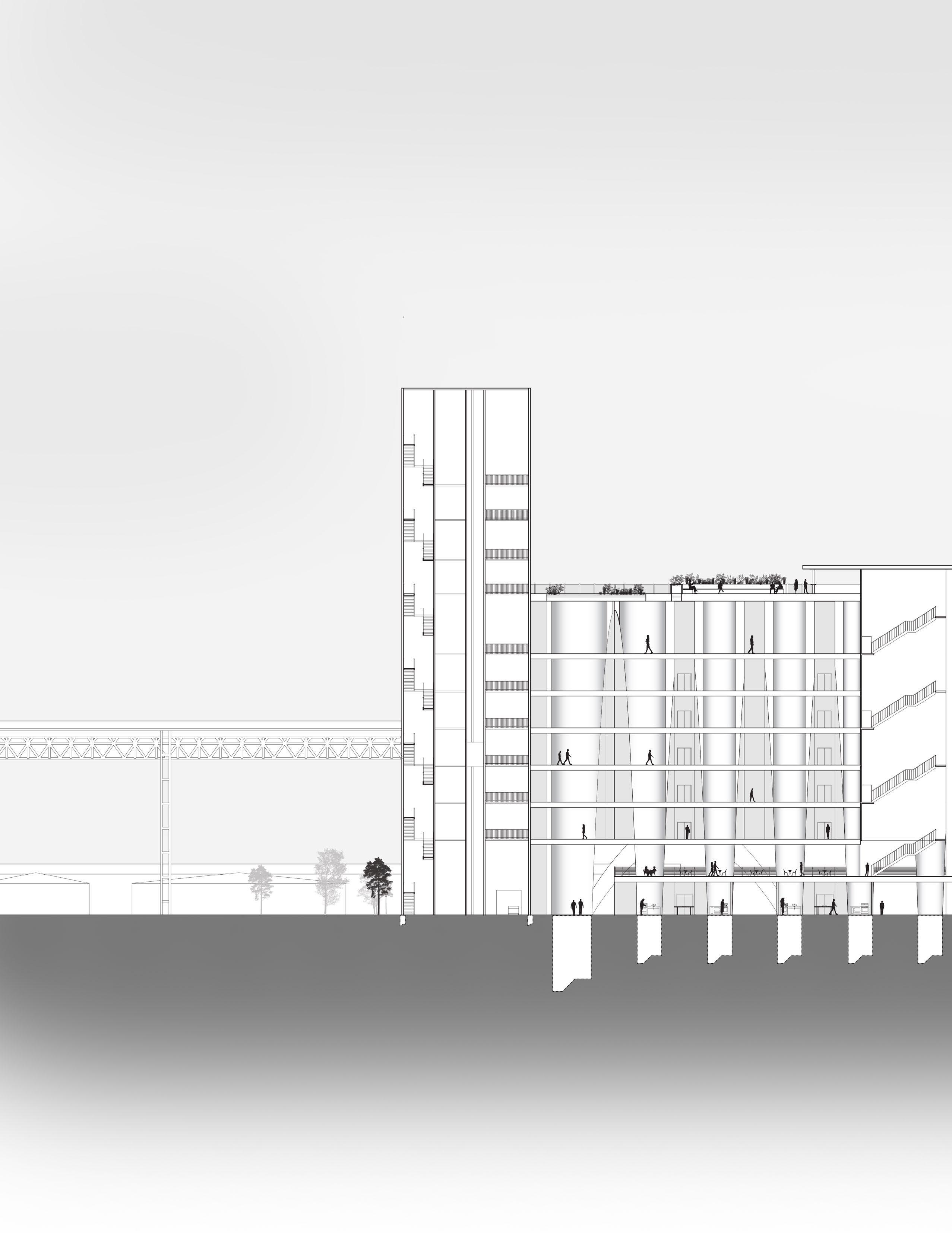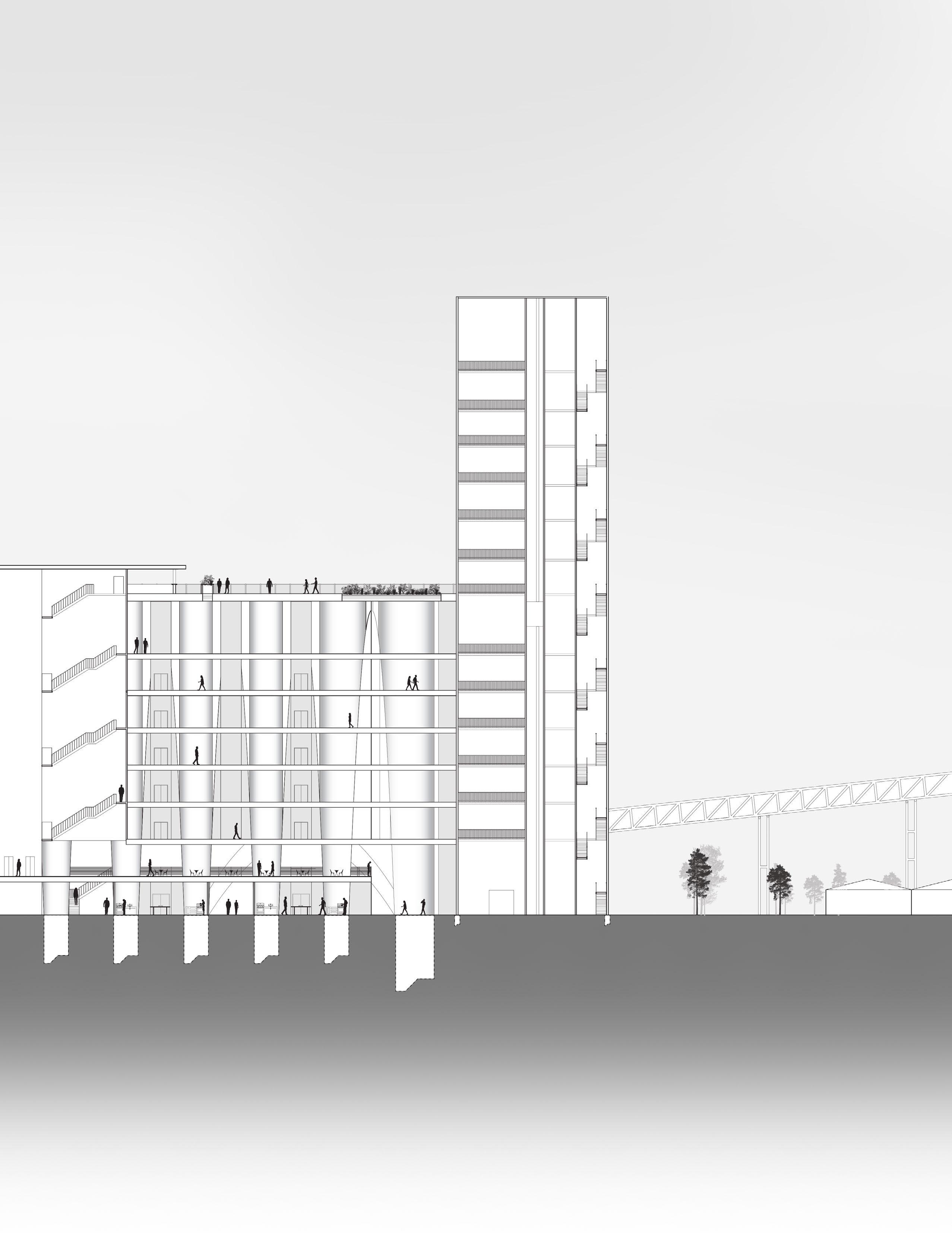 relied heavily on the visualization of columns, I created a forest-like column structure on the leftmost part of my design as opposed to the right side that consisted of the aforementioned, V-shaped columns. With the structure set in place, an interesting space arose from within the center of the program elements, and the pedestrian street became the heart of the design, as the main source of circulation now takes place within the ground floor. Taking a step back, one can see an interesting streetscape that was created not only with the help of the program elements but also due to the difference in structural columns that come with each program space and are left now with an inverse streetscape.
