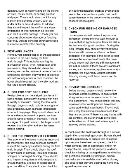 Before signing on the dotted line, conduct a final walkthrough of the property. This allows you to verify that the condition of the home aligns with your expectations and that any agreedupon repairs or changes have been completed satisfactorily.