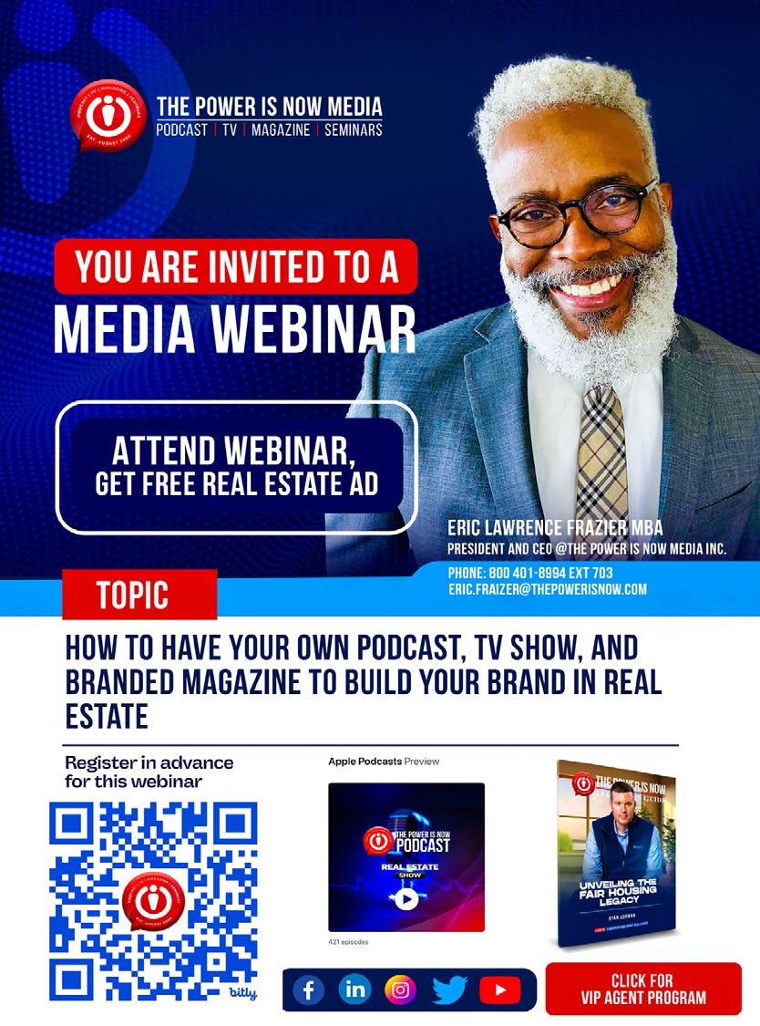 l 11 WWW.THEPOWERISNOW.COM Eric Lawrence Frazier MBA President and CEO eric.frazier@thepowerisnow.com The Power Is Now Media 714 475 8629 www.thepowerisnow.com Advisory Services | Real Estate | Mortgage | Finance | Business | Media Licenses: NMLS 461807. CA DRE 0143484.