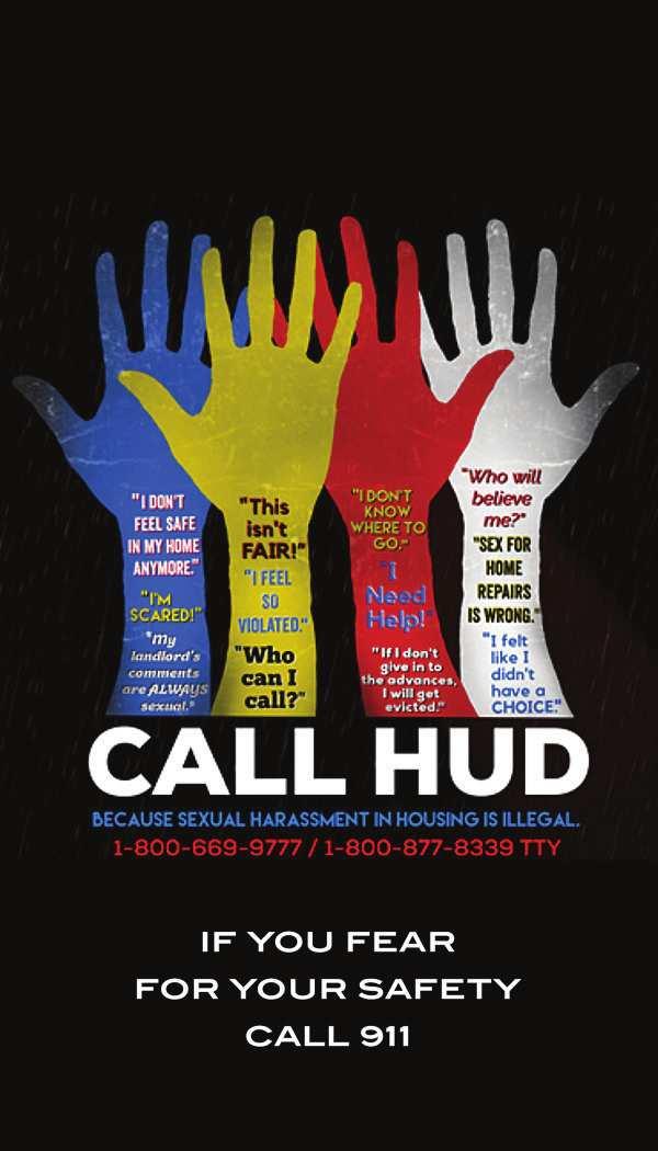 Fair Housing Is Your Right. Use It. Visit www.hud.gov/fairhousing or call the HUD Hotline 1-800-669-9777 (English/EspaƱol) 1-800-877-8339 (Fed Relay) A public service message from the U.S. Department of Housing and Urban Development. The federal Fair Housing Act prohibits discrimination because of race, color, religion, national origin, sex, familial status or disability. Individuals with disabilities, including HIV/AIDS, are protected