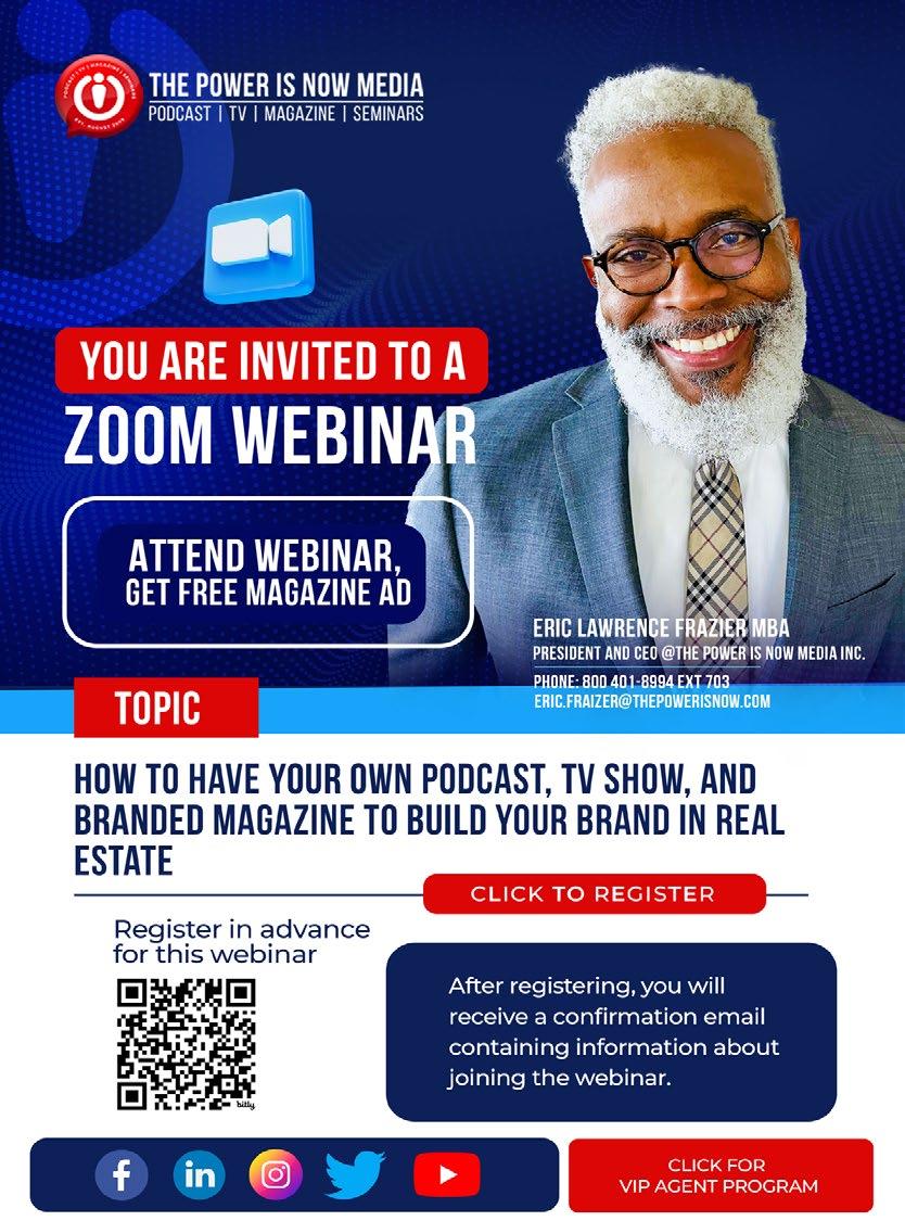 Eric Lawrence Frazier MBA President and CEO eric.frazier@thepowerisnow.com The Power Is Now Media 714 475 8629 www.thepowerisnow.com Advisory Services | Real Estate | Mortgage | Finance | Business | Media Licenses: NMLS 461807. CA DRE 0143484.