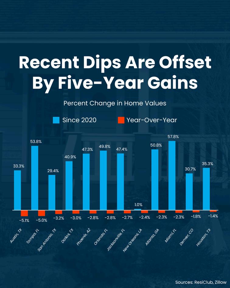 You need to put those drops in context Over the past five years, home prices rose by an average of 55% nationwide. That long-term gain far outweighs any short-term shift.
