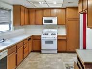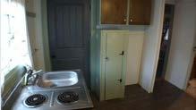 of cabinet space, a brick surround wood stove in the living room, and spacious