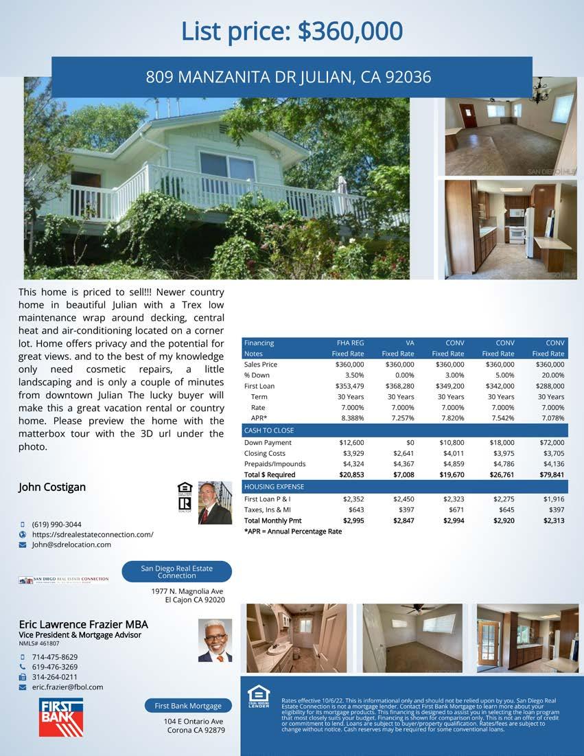 LISTED FOR $360,000 809 Manzanita Dr Julian, CA 92036