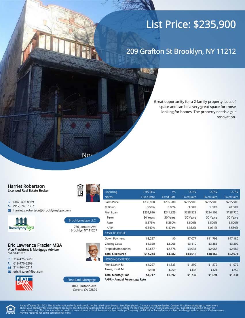 LIST PRICE: $235,900 209 GRAFTON ST BROOKLYN, NY 11212 Great opportunity for a 2 family property. Lots of space and can be a very great space for those looking for homes. The property needs a gut renovation CALL FOR DETAILS Harriet Robertson MLS#435429 m: (917) 952-7364 harriet.a.robertson@brooklynnybpo.com www.brooklynnybpo.com