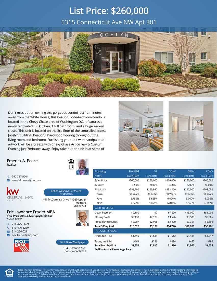 CONTACT THE AGENT: Emerick Peace NMLSID: 320004 Phone number: (240) 882-0198 Email: EmerickPeace@KW.com LIST PRICE: $260,000 5315 CONNECTICUT AVE NW #301 WASHINGTON, DC 20015 Don’t miss out on owning this gorgeous condo! Just 12 minutes away from the White Hou se, this beautiful one-bedroom condo is located in the Chevy Chase area of Washington DC. It features a newly renovated full kitchen, 1 full bathroom, and a huge walk-in closet. This unit is located on the 3rd floor of the controlled access Jocelyn Building. Beautiful hardwood flooring throughout the living room and bedroom. Furnishing your unit with handpainted artwork will be a breeze with Chevy Chase Art Gallery & Custom Framing just 7minutes away. Enjoy take-out or dine in at some of the city’s favorite restaurants which are just minutes away. You don’t want to let this one pass you by!