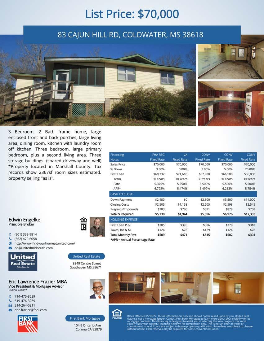 YOUR POWER TO BUY A HOME IS NOW! 83 Cajun Hill Rd, Coldwater, MS 38618 Offered at $70,000 PROPERTY INFORMATION 3 Bedroom, 2 Bath frame home, large enclosed front and back porches, large living area, dining room, kitchen with laundry room off kitchen. Three bedroom, large primary bedroom, plus a second living area. Three storage buildings. (shared driveway and well) *Property located in Marshall County. Tax records show 2367sf room sizes estimated. property selling ‘’as is’’. CALL ME FOR DETAILS: Edwin Engelke O: (662) 470-6058 C: (901) 338-9814 www.findyourhomeatunited.com