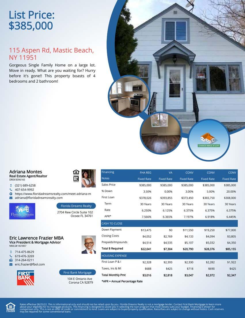 YOUR POWER TO BUY A HOME IS NOW! 115 Aspen Rd, Mastic Beach, NY 11951 Offered at $385,000 PROPERTY INFORMATION Gorgeous Single Family Home on a large lot. Move in ready. What are you waiting for? Hurry before it’s gone!! This property boasts of 4 bedrooms and 2 bathroom! CALL ME FOR DETAILS: ADRIANA MONTES, JD MBA m: (321) 689-6258 adriana@floridadreamsrealty.com www.floridadreamsrealty.com