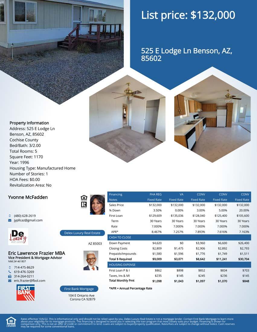 YOUR POWER TO BUY A HOME IS NOW! 525 E Lodge Ln Benson, AZ, 85602 Cochise County Offered at $132,000 PROPERTY INFORMATION Bed/Bath: 3/2.00 Total Rooms: 5 Square Feet: 1170 Year: 1996 Housing Type: Manufactured Home Lot Size: 23958.00 sq ft CALL ME FOR DETAILS: Yvonne McFadden Direct: (480) 628-2619 www.yvonnemcfaddenrealtor.com